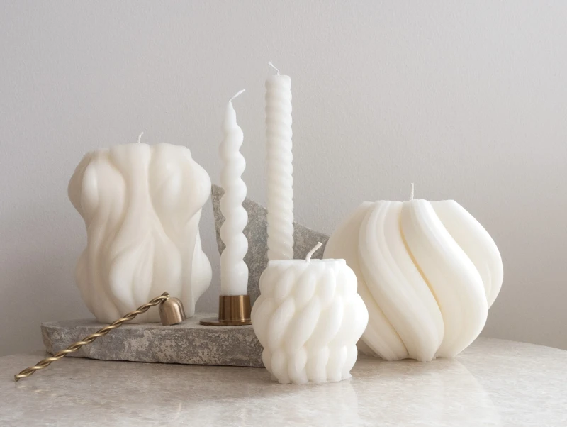 Veke Svedenin kauniisti muotoiltuja steariinikynttilöitä. Vasemmalta Stock, Skruv, Spiral, Tvist ja Virvel.