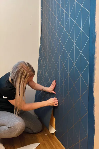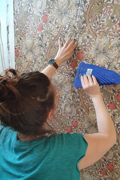 Laura Johansson tasoittaa mahdollisia kuplia pakkelilastalla. Tapetin nimi on Golden Lily Morris & Co:lta.