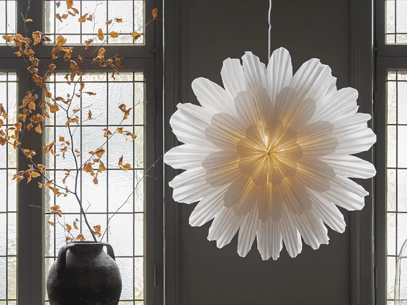 The star Snowflower is one of Watt and Veke's most popular. The star is available in both 68 cm in diameter and 44 cm in diameter. It is made of semi-transparent paper and has a graceful, multi-dimensional design.