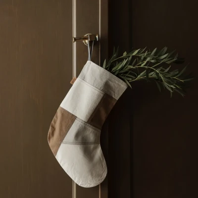 The Tonal Christmas stocking and Christmas tree skirt with the same name and pattern (in the top image) are made of organic cotton. The stocking and skirt are made using patchwork with brown and beige patches sewn together with elegant stitches. Natural colors for those who want a mild color scheme even at Christmas.