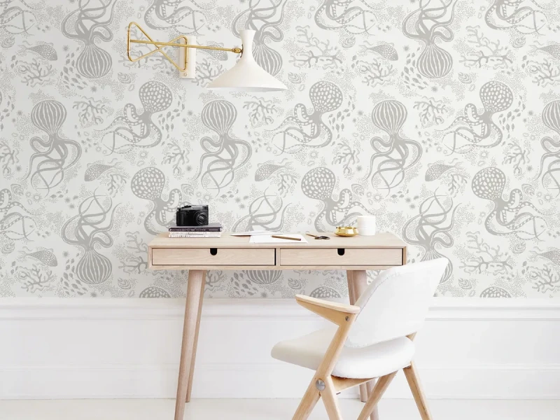 Littlephants wallpaper Aquatic with octopuses and corals is available in two mild color options.