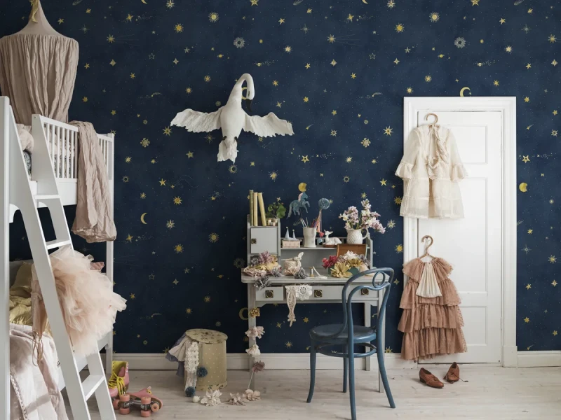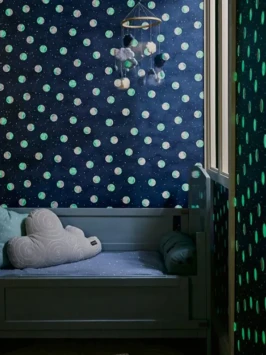 Eijffinger's wallpaper Glow In The Dark from the Mini Me collection glows in the dark, offering comfort in the children's room when it doesn't get completely dark at night.