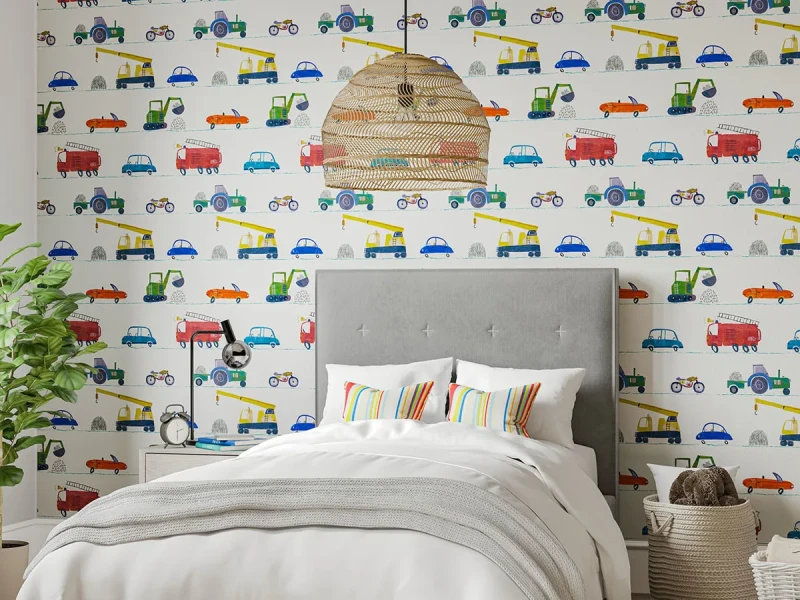 Wallpaper Just Keep Trucking from Harlequin is a colorful favorite with all kinds of different vehicles.