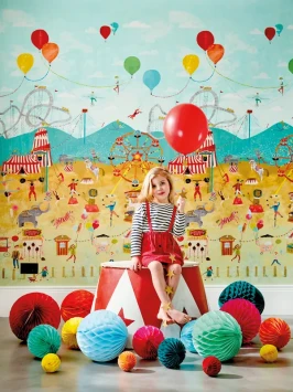 Hide and Seek with lovely animals playing hide and seek, Above and Below depicting life above and below the water surface, Rainbow Brights with colorful rainbows in a graphic pattern, and the detailed Life's A Circus showing life at a fairground. These wallpapers spark play; children find new details every day.