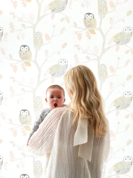 The sweet wallpaper Little Owls from Harlequin with owls watching over the sleeping child is a nice wallpaper for the nursery!