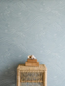 The fish swim in the blue waves on Ferm Living's wallpaper Stream. The same pattern is also found in bed linens and a lampshade.