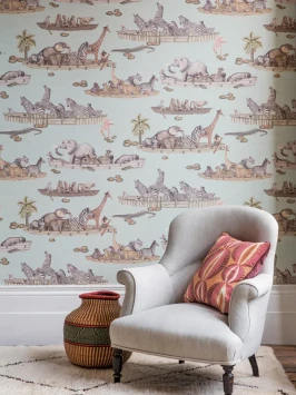 Cole & Sons's wallpaper Zambezi from the exotic collection Ardmore brings thoughts to Noah's ark with all the animals being transported on rafts.
