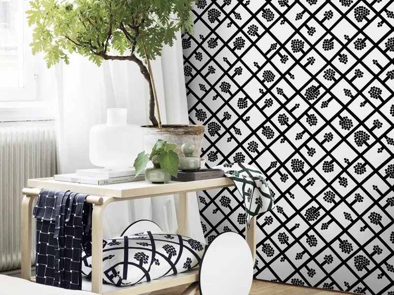 Marimekko's Räsymatto pattern is something of a classic. Now it is also available as wallpaper, in two color options. Räsymatto was created by Maija Louekari.
