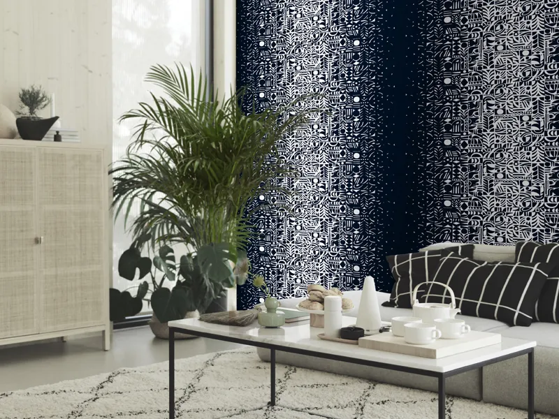 Yön varjo is overall a fantastic, mysterious, and even somewhat dominant wallpaper. This graphic wallpaper with a modern pattern creates a fine impression on a feature wall in modern homes. The wallpaper's creator is Sanna Annukka. Two color options.