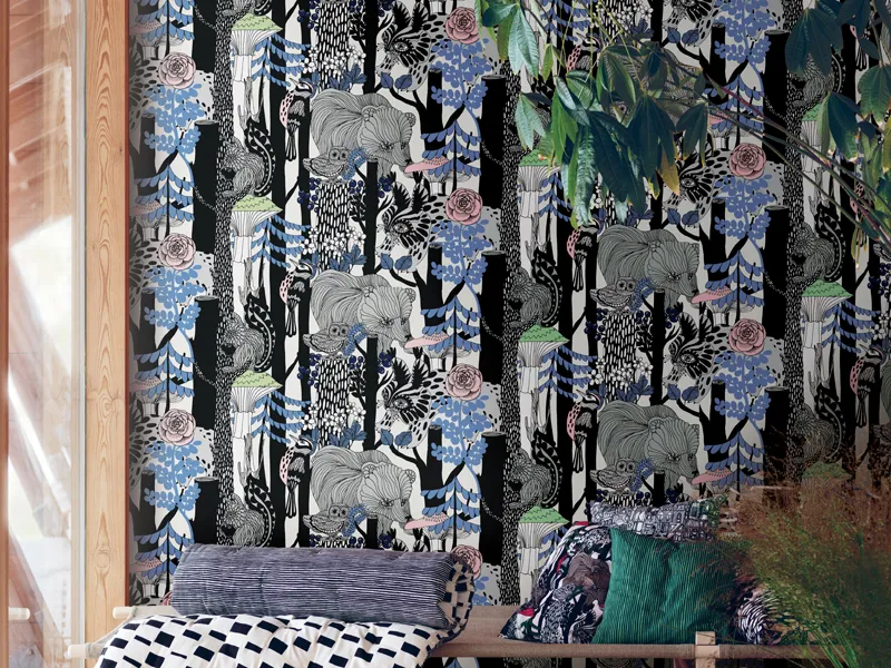 Marimekko Veljekset is designed to honor the 100-year independence of Finland. The wallpaper's inspiration comes from Finnish nature, its animals, and plants. The creator is Maija Louekari.