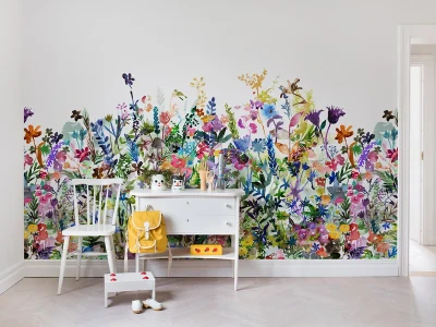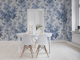 Blooming is like an oil painting of an intense, densely patterned flower bouquet. Harmony is a calm mural wallpaper that, with its soft and relaxing aura, is perfect for those who seek a calm and harmonious expression in their interior. Alice's Garden takes us to a flower meadow in Alice's Wonderland. Alice's Garden is an excellent choice for giving the room a playful and enchanting touch. Porcelain is like a blue, chipped, and cracked porcelain coffee cup. With its distinctive design and character, it creates an interesting contrast and gives a touch of vintage and charm to the room.