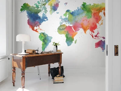 School Atlas recalls memories from school times and presents a classic world map. With its clear lines and geographical details, it becomes a timeless and informative wallpaper that provides a nostalgic feeling of discovery and knowledge.Rainbow World is like a watercolor painting in all the colors of the rainbow. This world map gives a playful and artistic twist to the traditional map image. With its vibrant hues and fluid color transitions, it becomes an eye-catching and lively wallpaper that fills the room with joy and creativity.