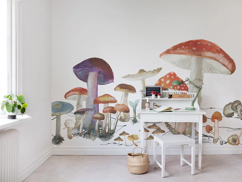 In children's rooms, wallpapers are ideally playful and colorful, and Rebel Walls has many such varieties in their collection. With the mural wallpaper Woods of Wonder featuring giant mushrooms, it feels like you have shrunk in size. The Rabbits Playground sparks imagination with forest animals ready for new adventures. The floral May Meadow is like a colorful and cheerful flower meadow, a mural wallpaper that fits just as well in the children's room as it does in the rest of the home.