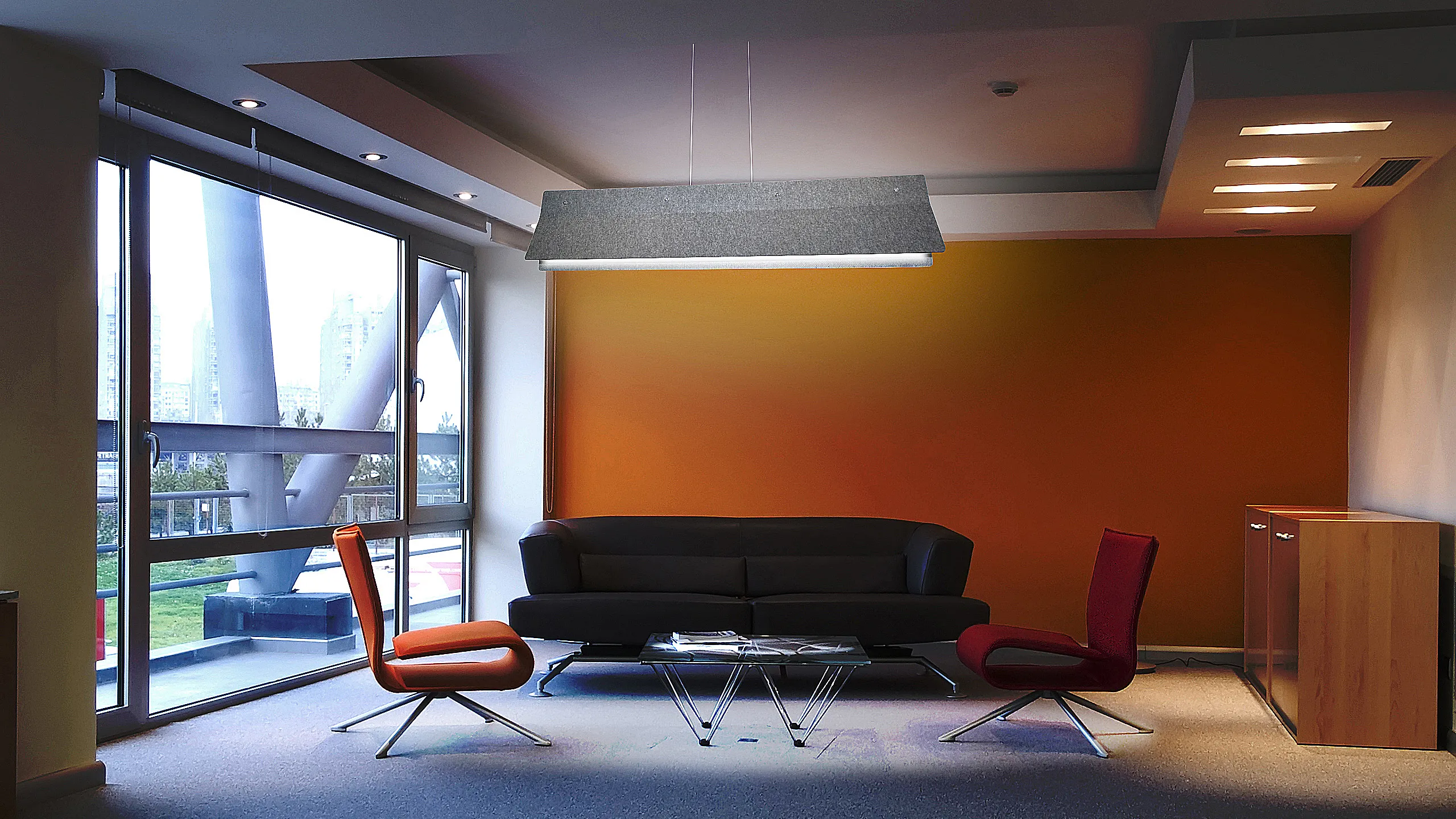 The Acoustic Lamp Acoustic Line fits both in public environments and private homes. The LED lamp is perfect, for example, above the meeting table, in the auditorium, or above the dining table at home where the ceiling height is high. The acoustic lamp is made of felt, which in laboratory tests has shown to have good sound-dampening effect. The dimmable lamp is manufactured in Finland and designed by Karl-Erik Grönlund.