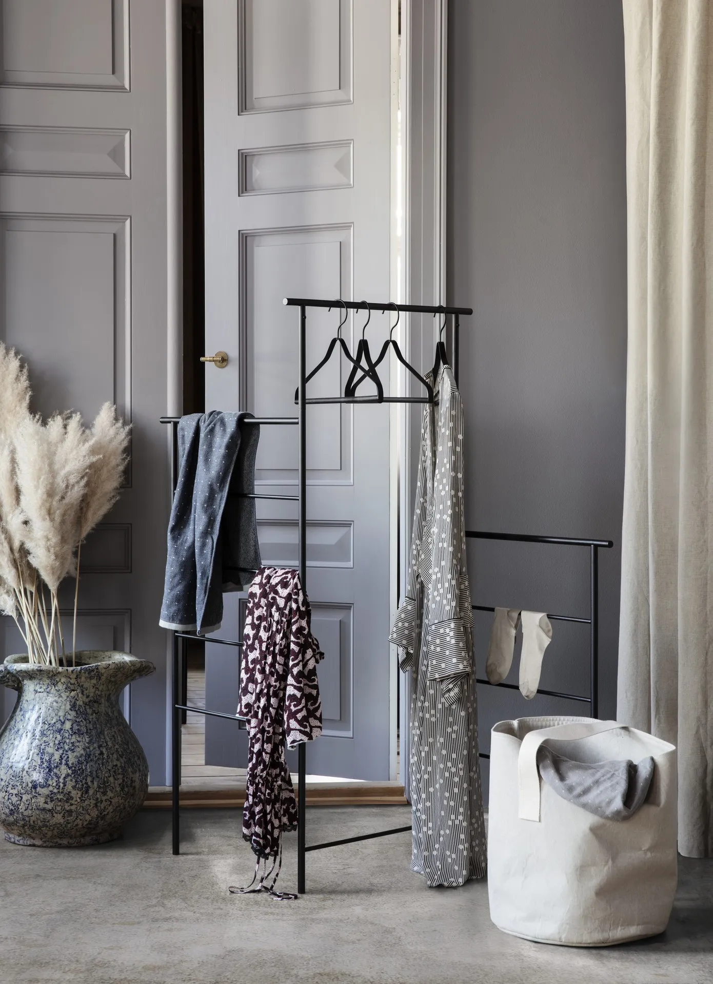 Ferm Living's stylish clothes rack Dora consists of three parts and can be folded when not in use. Dora is aesthetic and minimalist. The clothes rack can be used as a drying rack, a room divider, or for clothes that are in use but do not need to be washed yet.