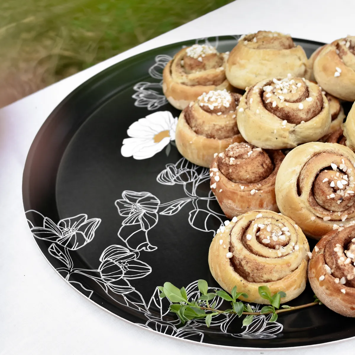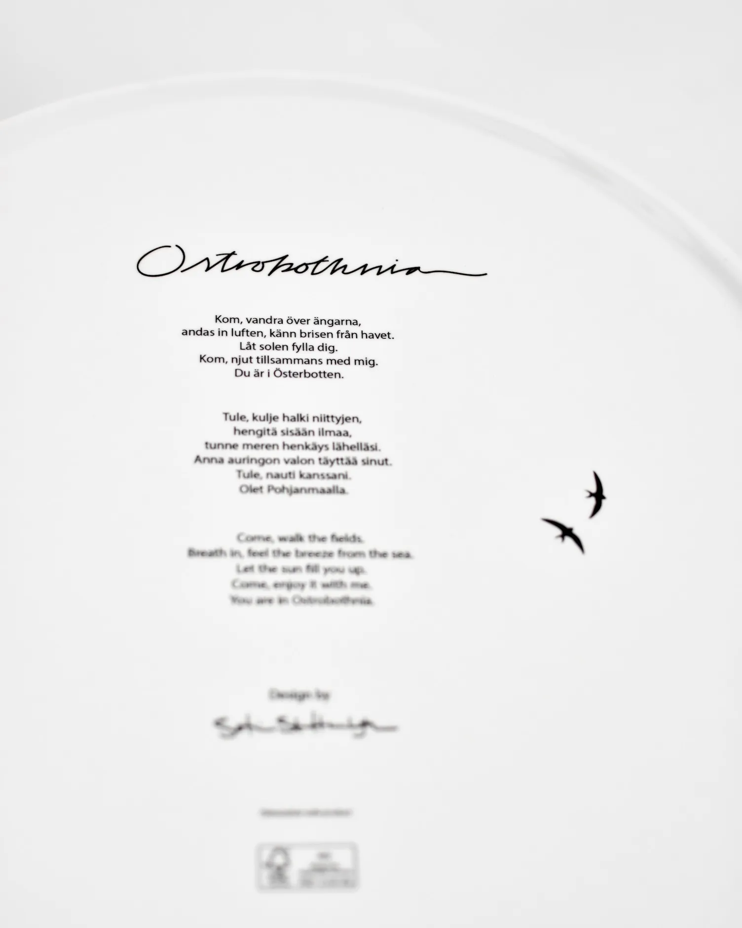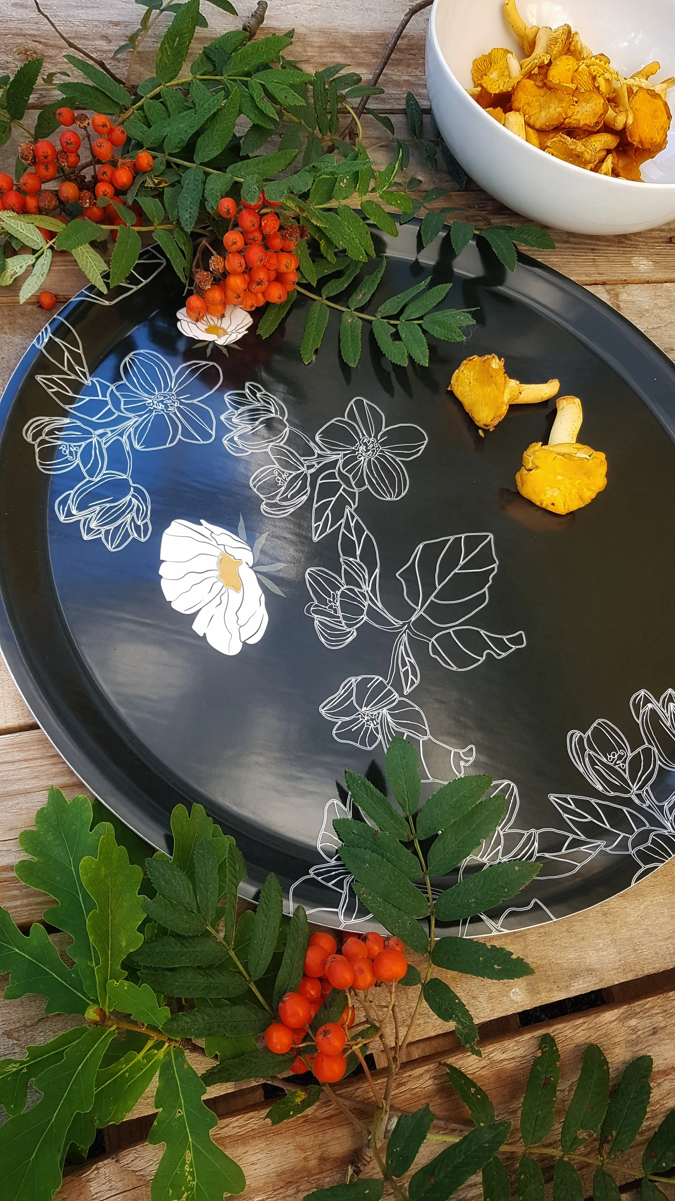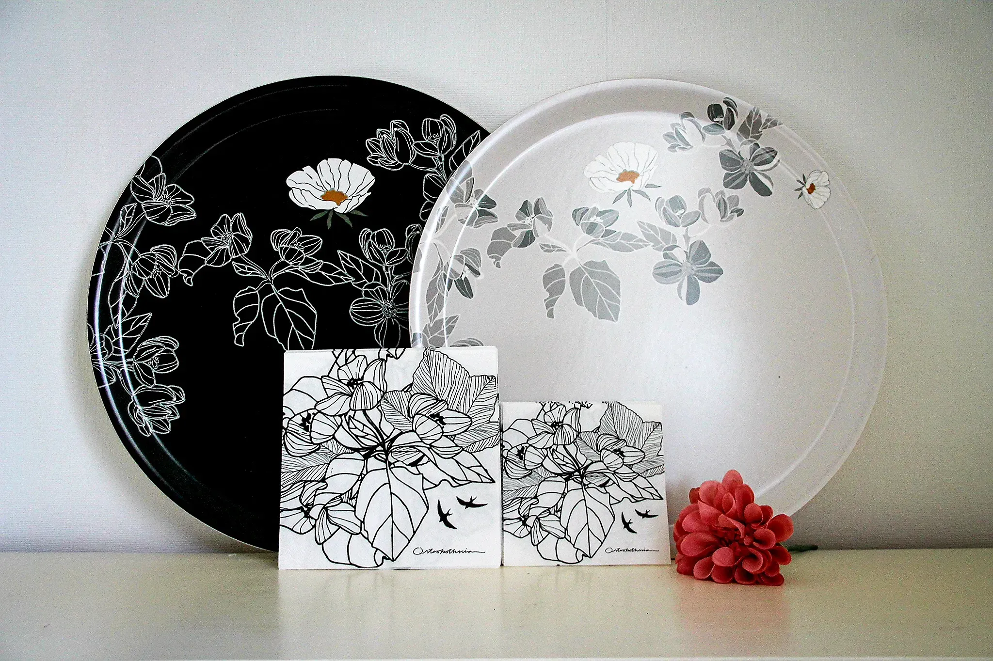 Johanna is our black tray, inspired by Midsummer. The Midsummer tray features a black base with a delicate apple blossom pattern accompanied by Midsummer roses. The Ostrobothnia series is a Finnish design series that draws its inspiration from the nature of Ostrobothnia.