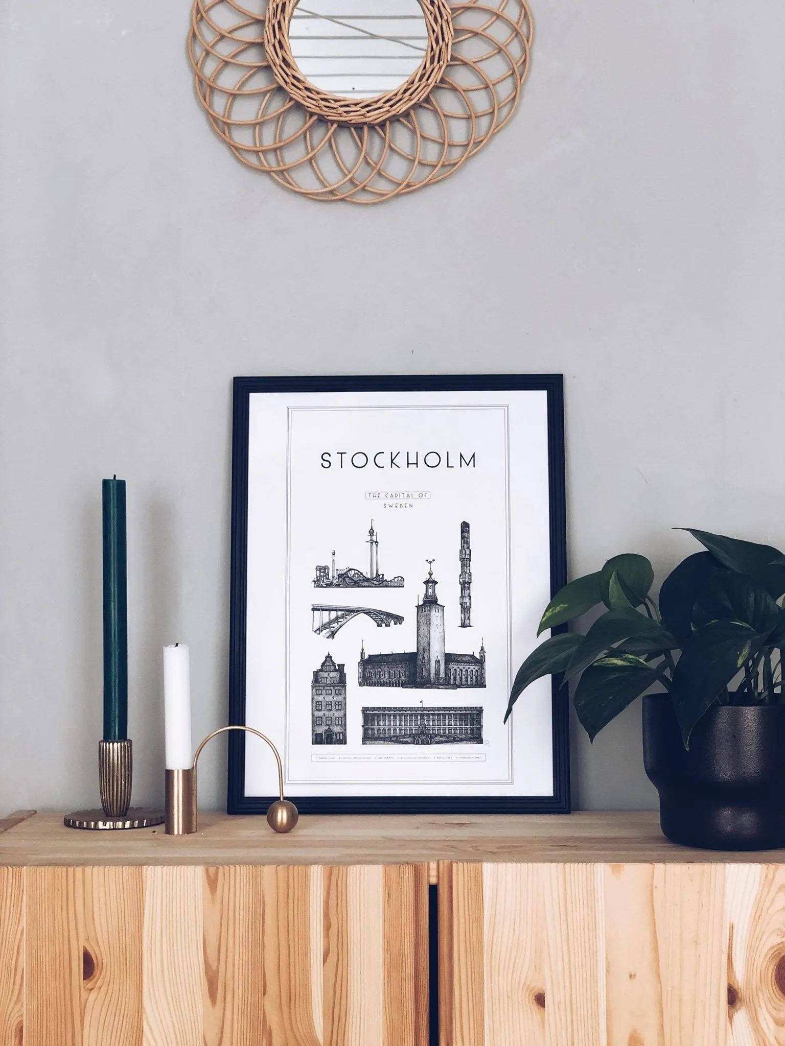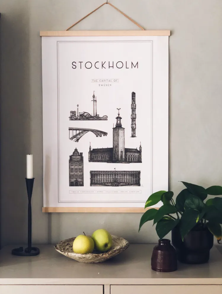 The Stockholm poster is a unique city poster of high quality by the young and talented artist Julia Bäck. The poster features six famous buildings and monuments from the city of Stockholm.