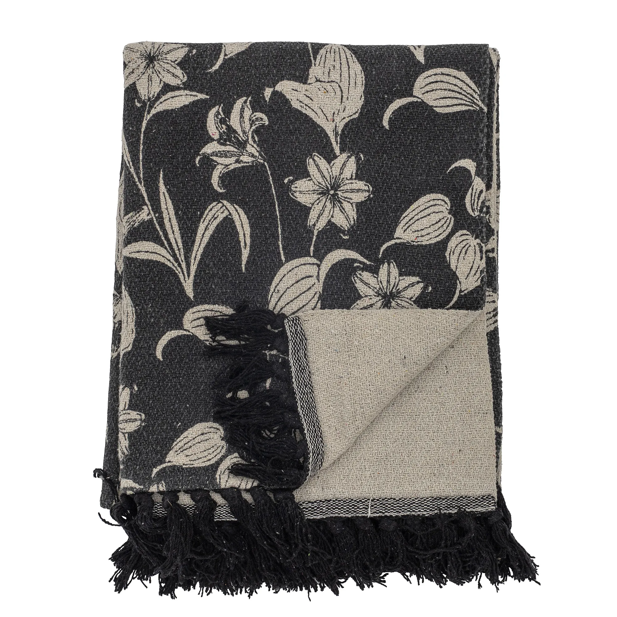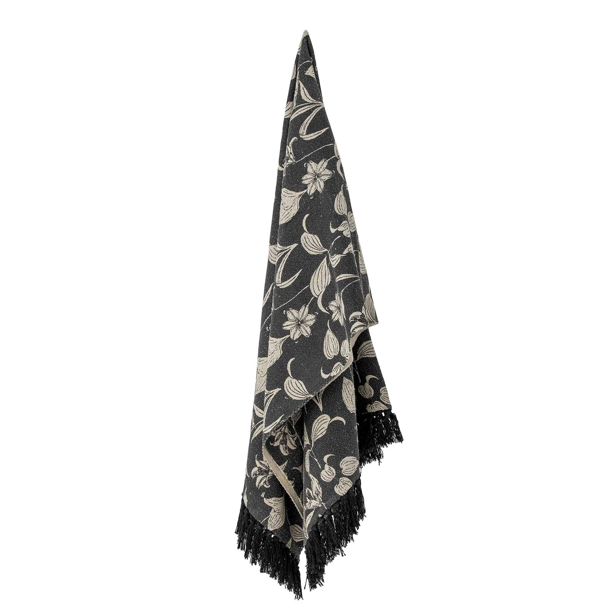 The floral blanket Mali Throw in black and beige is soft and comfortable. The blanket is made from recycled cotton. A nice blanket for the living room sofa, bed, or balcony.
