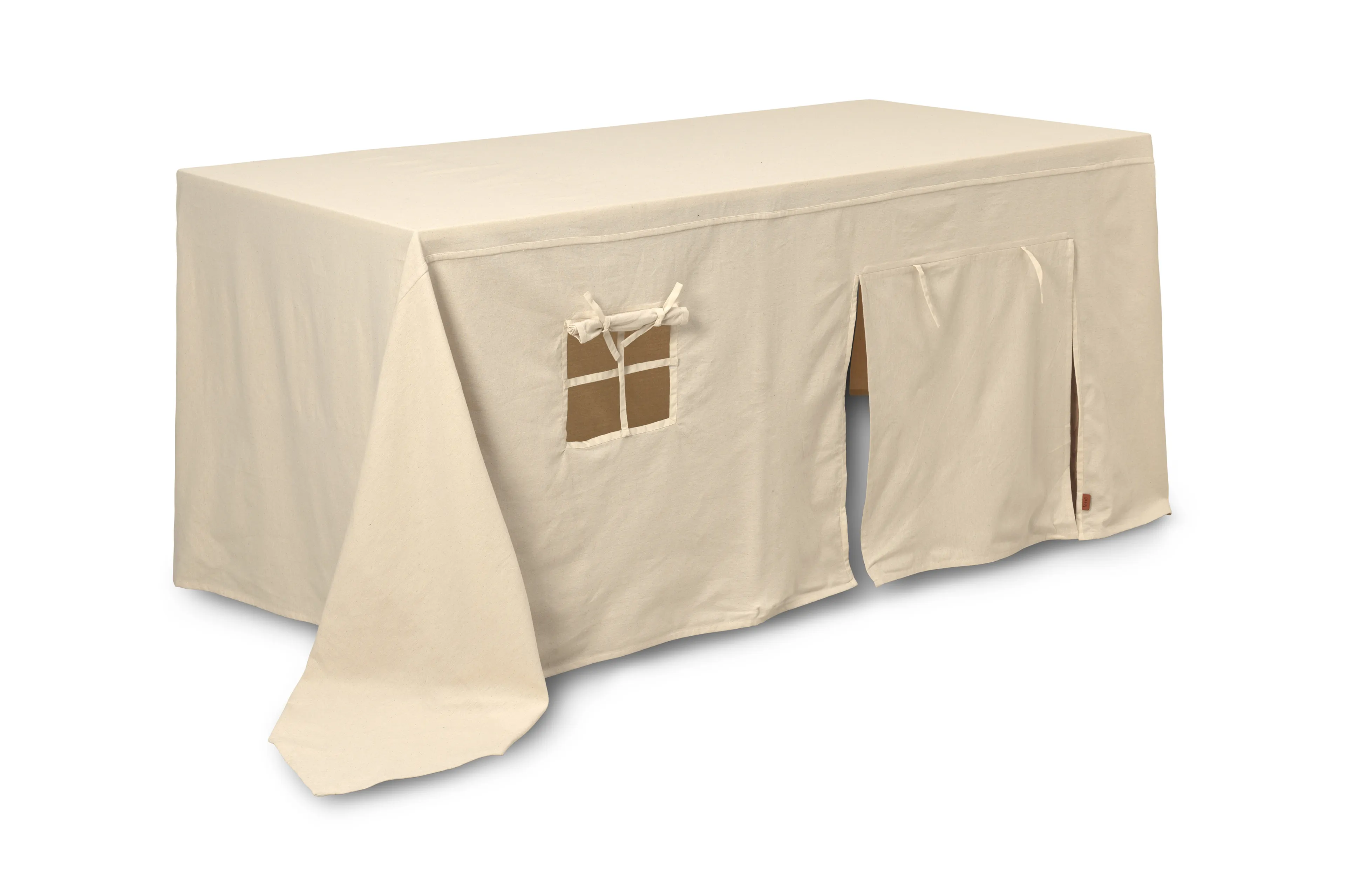 Ferm Living's Settle Table Cloth House from Denmark is a fun and practical tablecloth for the dining table. Here, playing under the table is allowed! The child gets a calm place to play in peace or a perfect hideaway from the world. Made of uncolored cotton and with windows and doors that can be opened or closed.