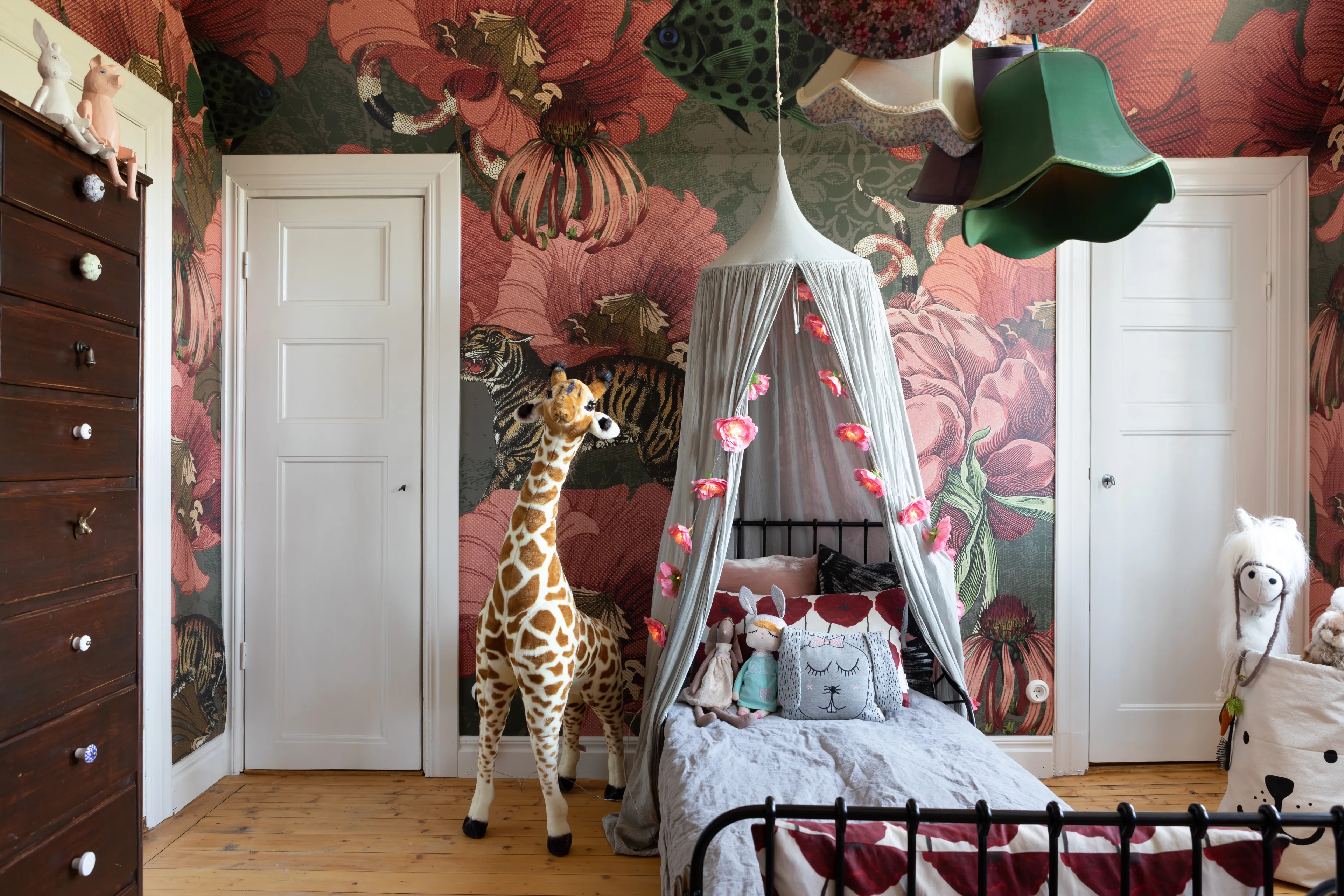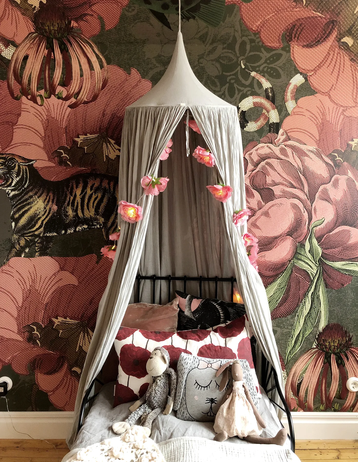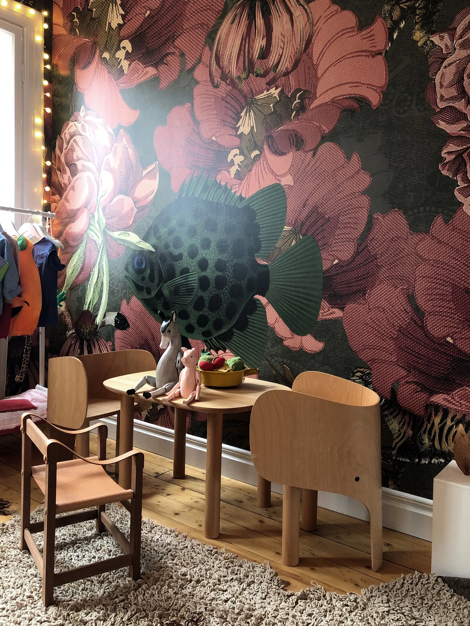 Wallpaper Betty Pretty is unique with its large, colorful and cool pattern featuring flowers, fish, and animals. A lovely wallpaper for bedrooms, children's rooms, teenagers' rooms, or living rooms. The wallpaper is custom ordered according to your measurements. It costs 45 euros per square meter + a handling fee of 65 euros per order.