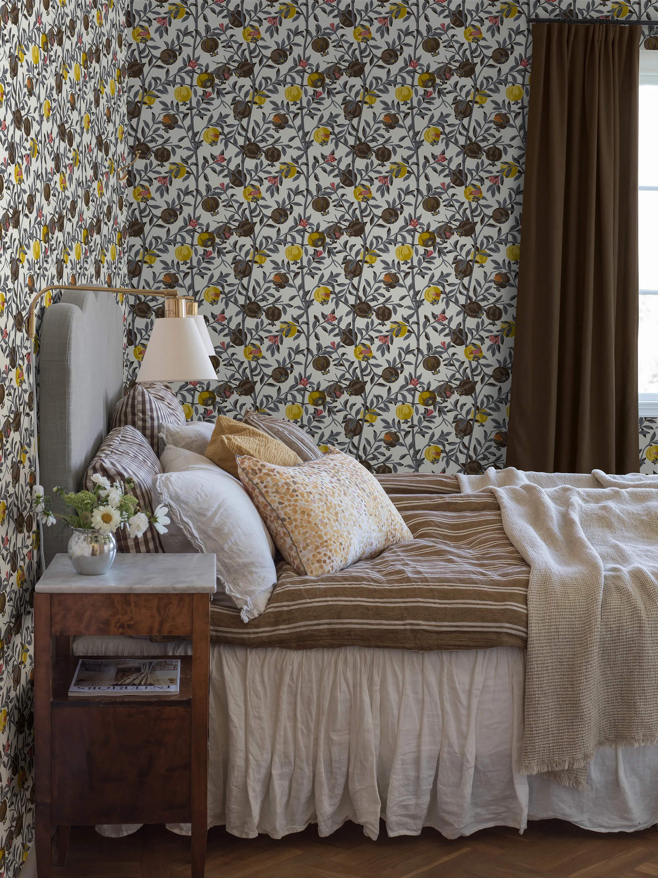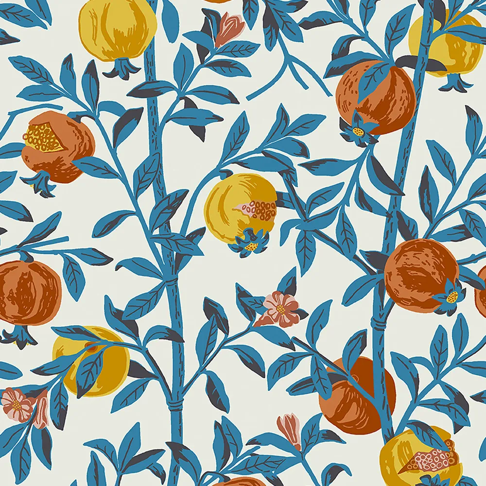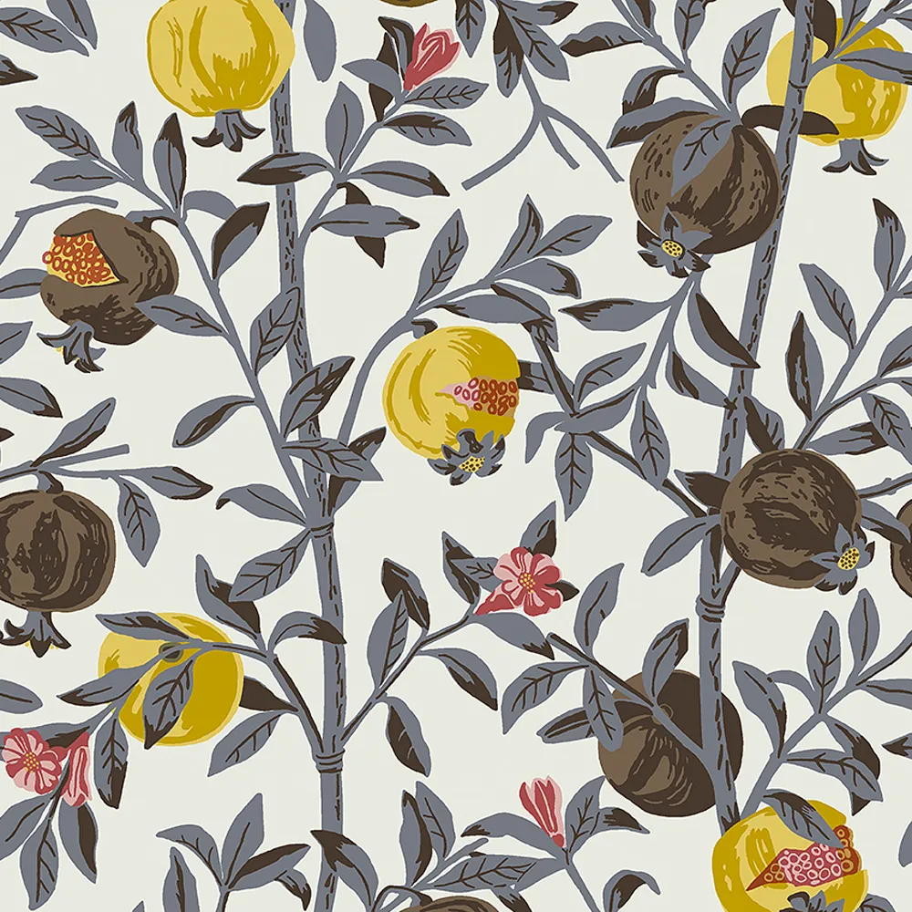 Design wallpaper Pomegranate was created in the 1960s by Gocken Jobs. The classic wallpaper with pomegranates, winding twigs, and flowers is suitable for bedrooms, offices, kitchens, and dining rooms.