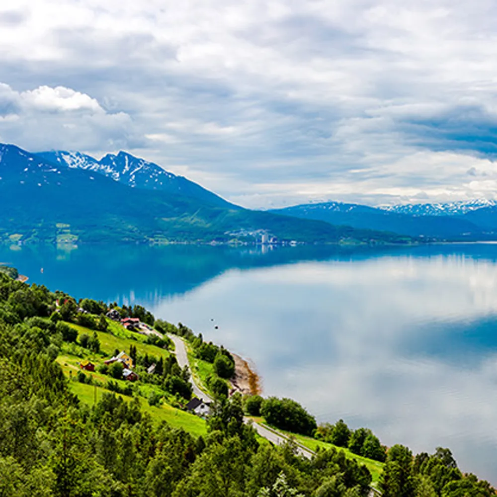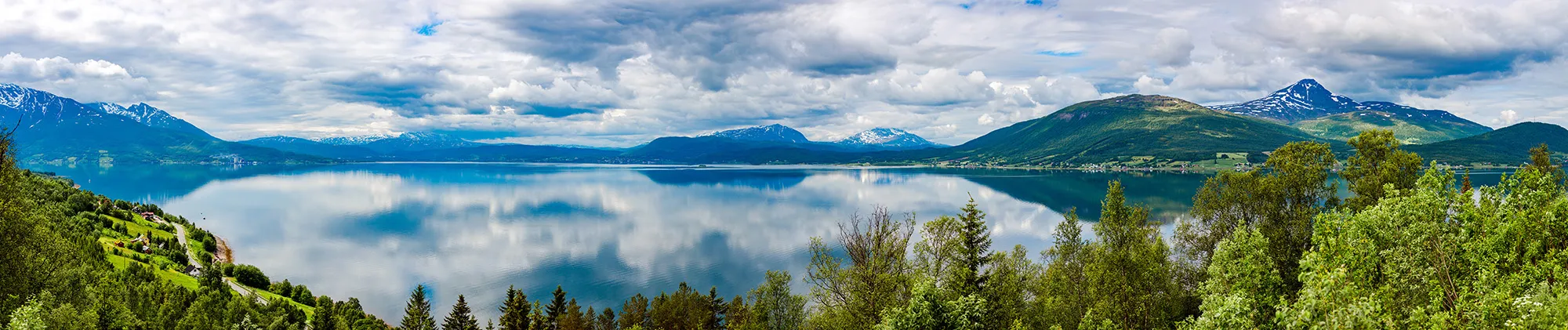Photomural Horizon shows a majestic panoramic view with mountain peaks and clouds reflecting in the lake. An impressive mural for the living room, office, or children's room.
