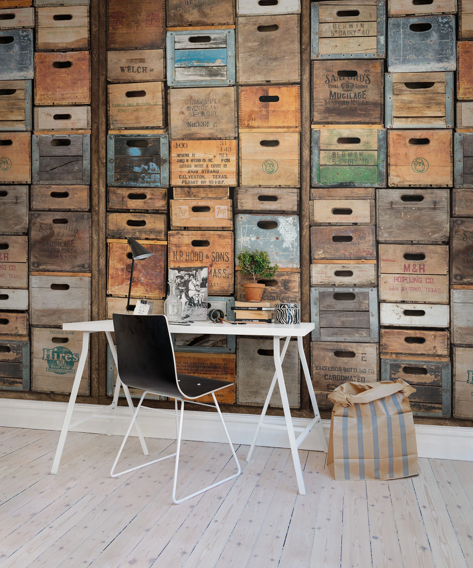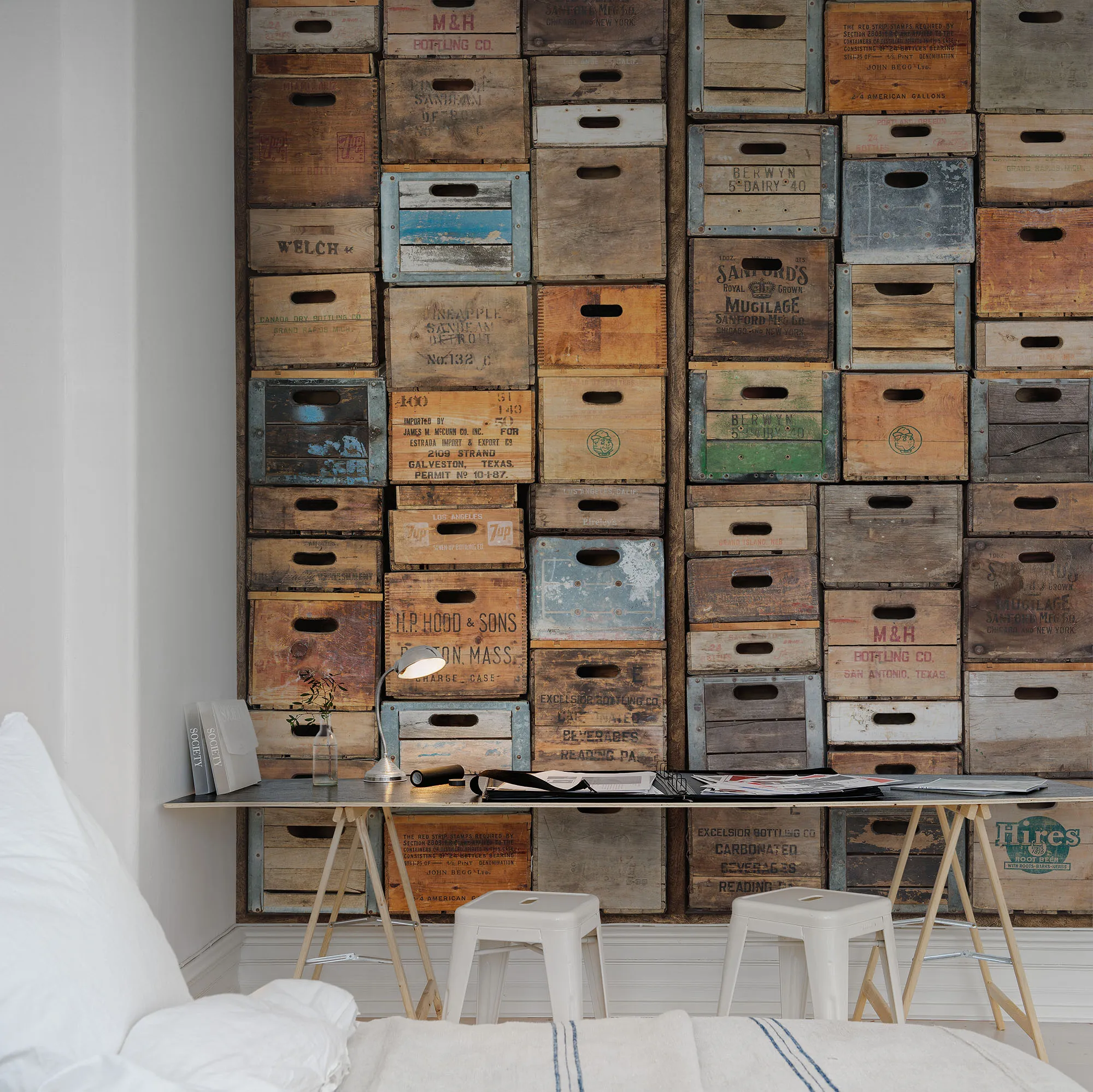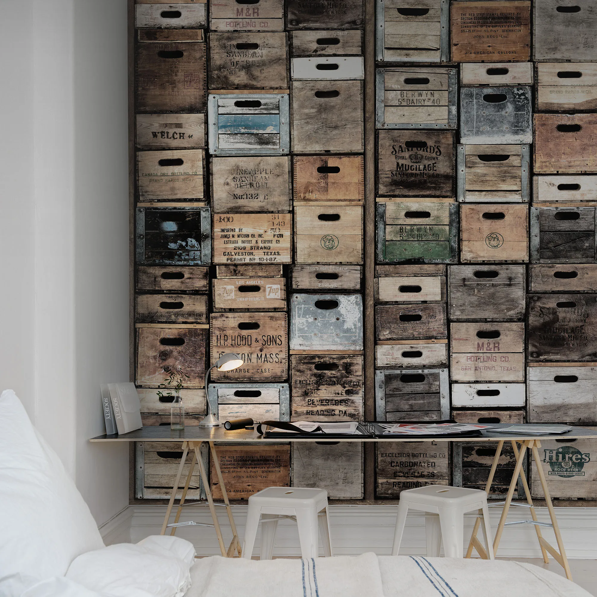 Muraltapeten Industriel Urban Farm LA has an industrial touch with stacked wooden boxes. The wallpaper feels three-dimensional. It is suitable for the home office, bedroom, hallway, or kitchen.