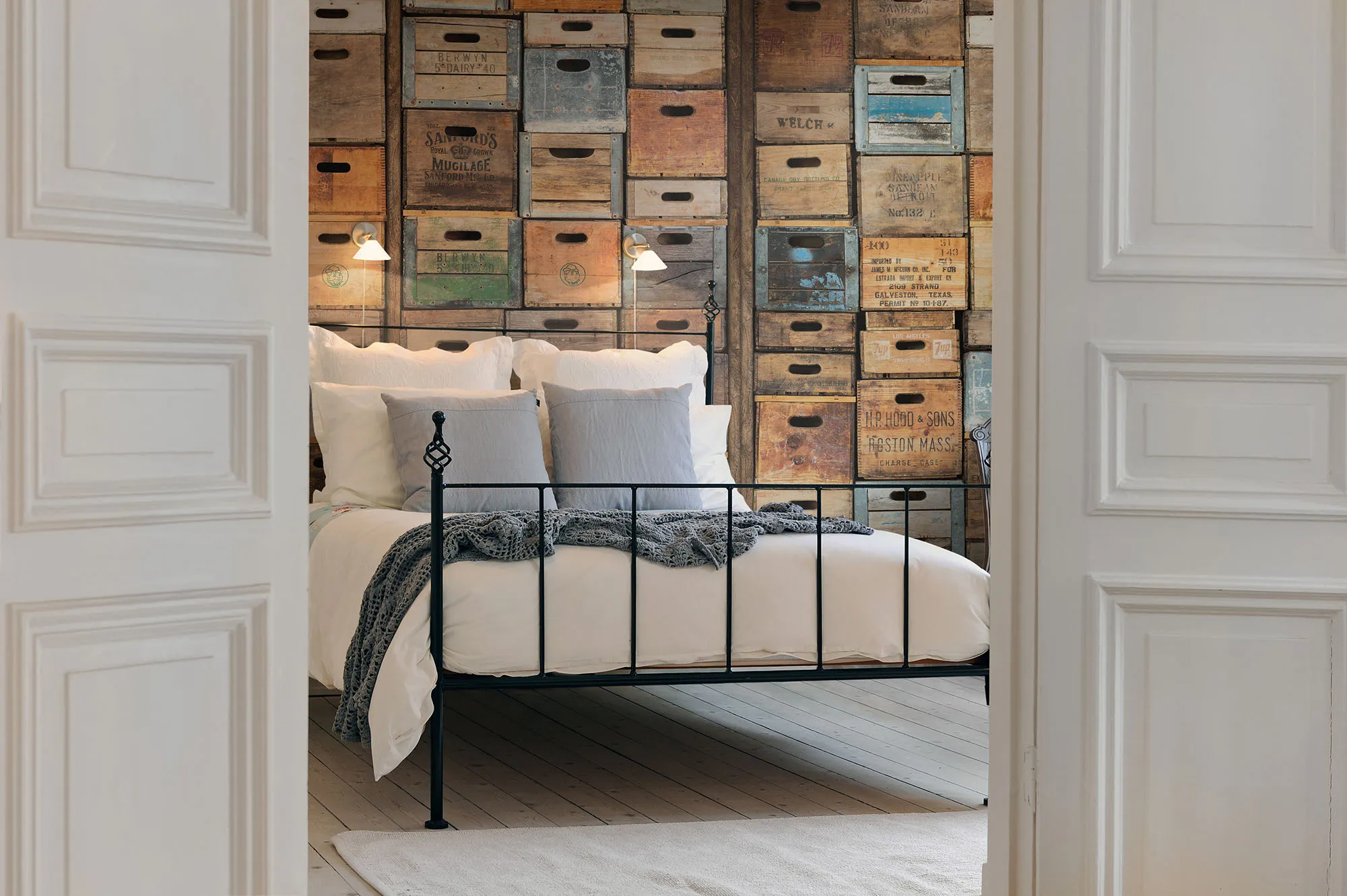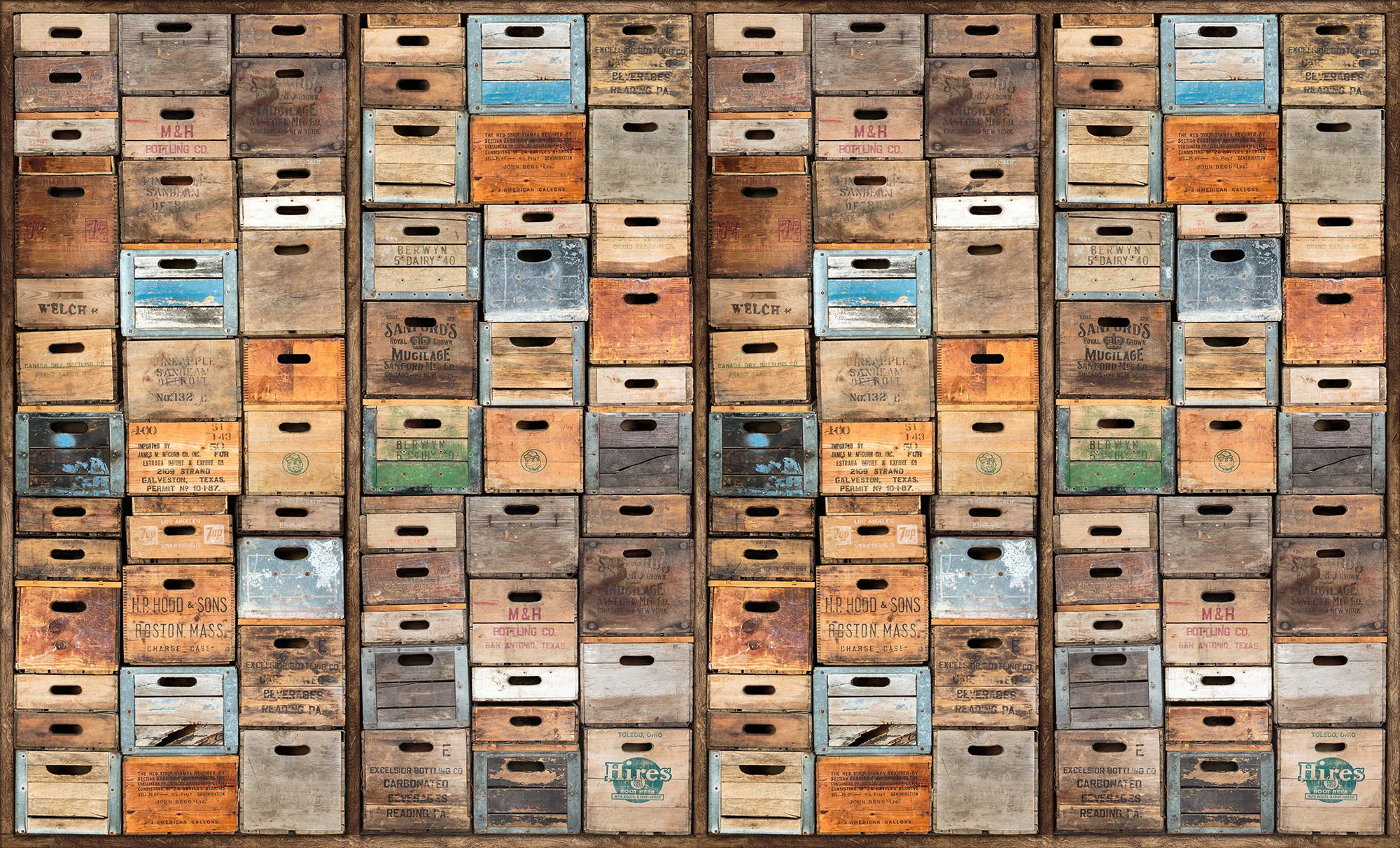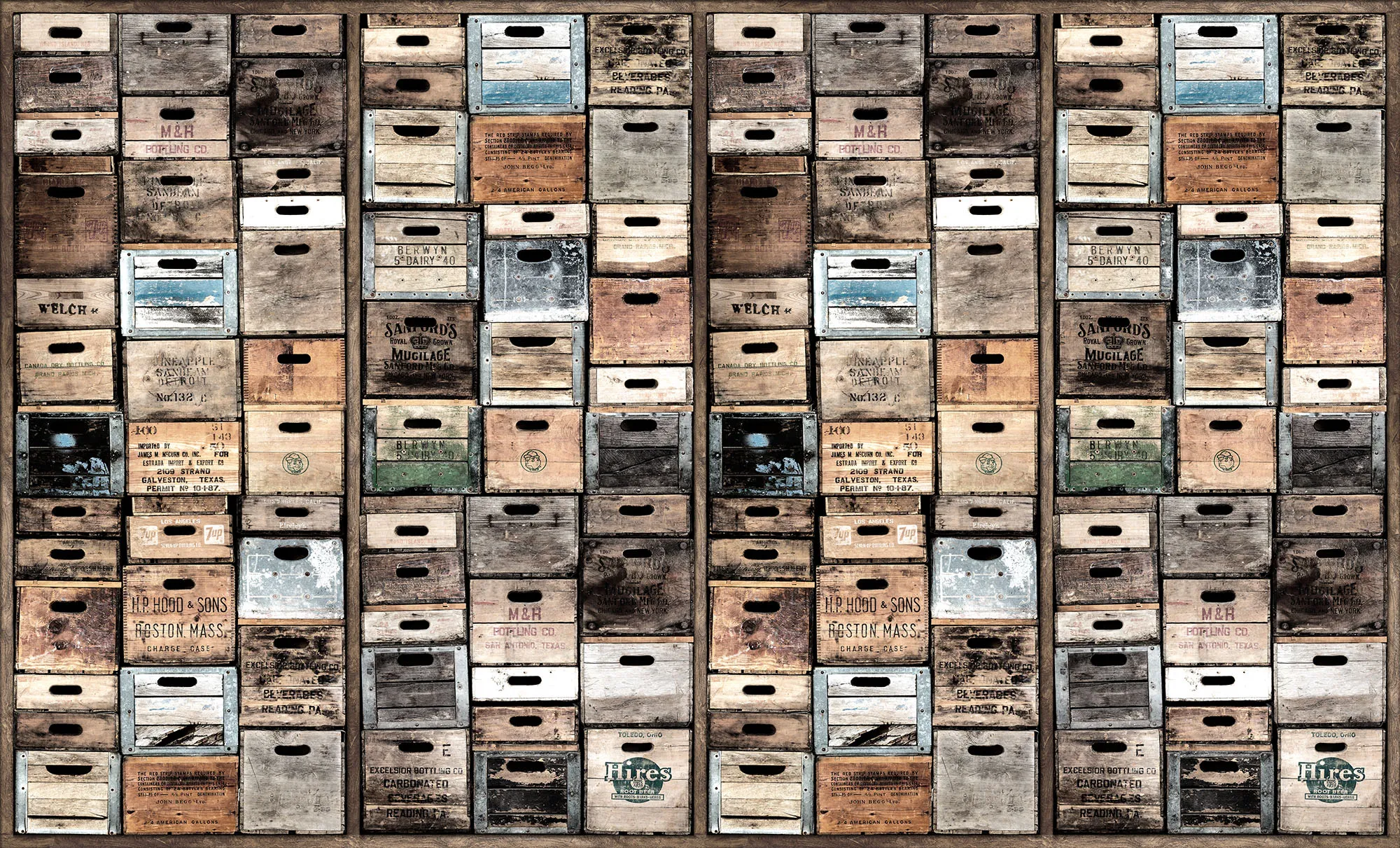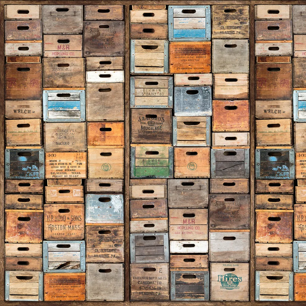 Muraltapeten Industriel Urban Farm LA has an industrial touch with stacked wooden boxes. The wallpaper feels three-dimensional. It is suitable for the home office, bedroom, hallway, or kitchen.