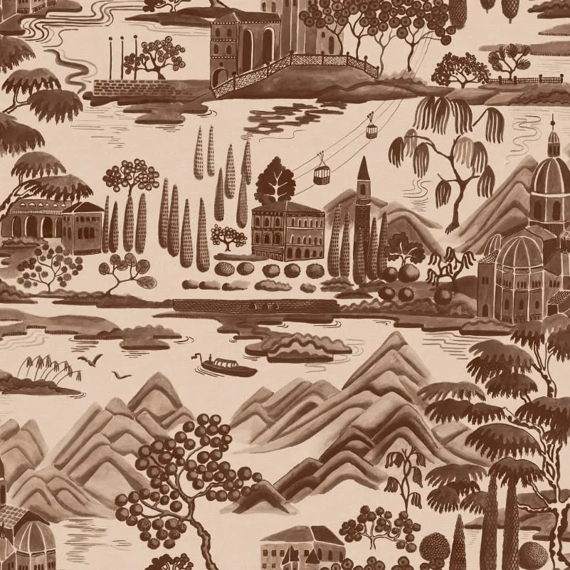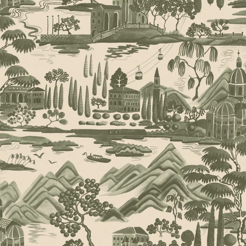 The Lake Como wallpaper is a toile-inspired landscape wallpaper where villas, lake, mountains, and architectural details create a story unfolding on the wall. The pattern is not only decorative but also a view where different elements gradually reveal themselves, offering richness to observe.