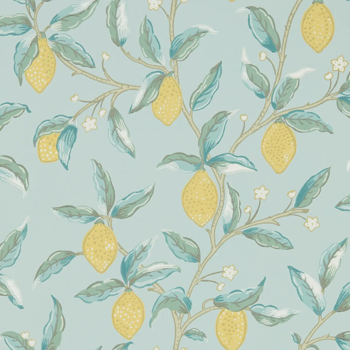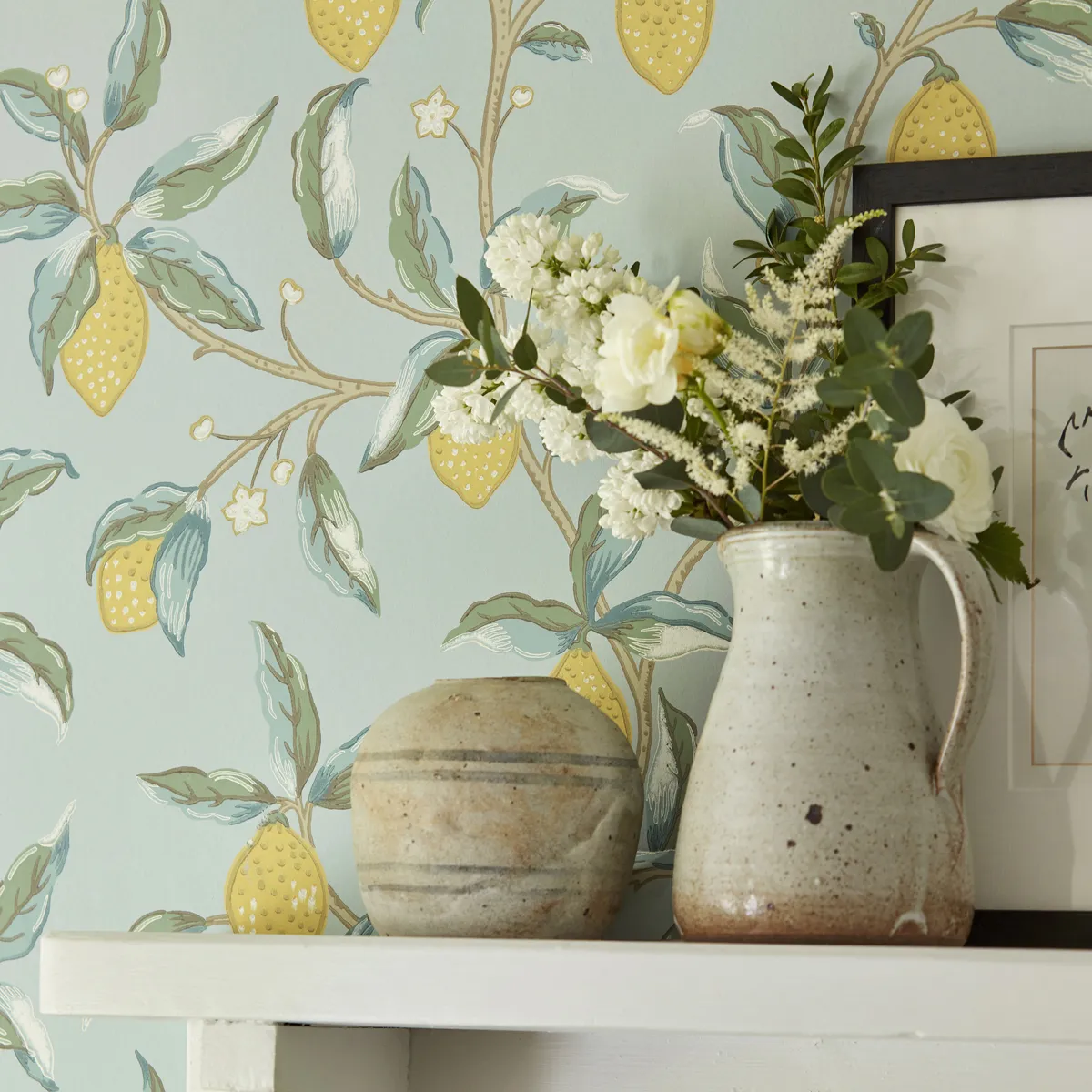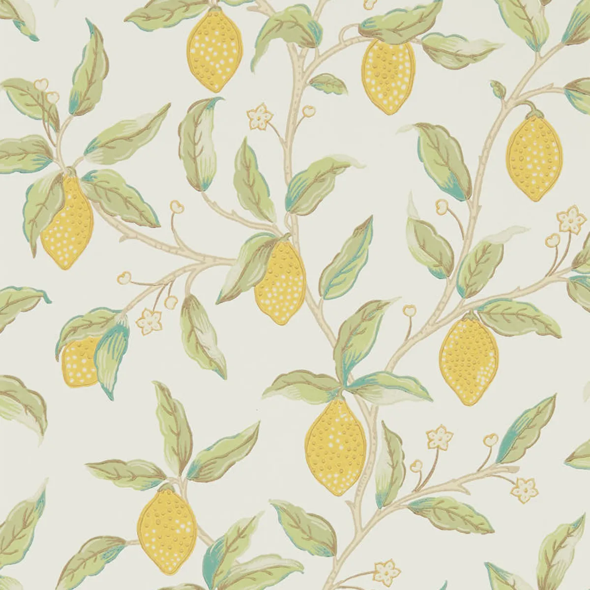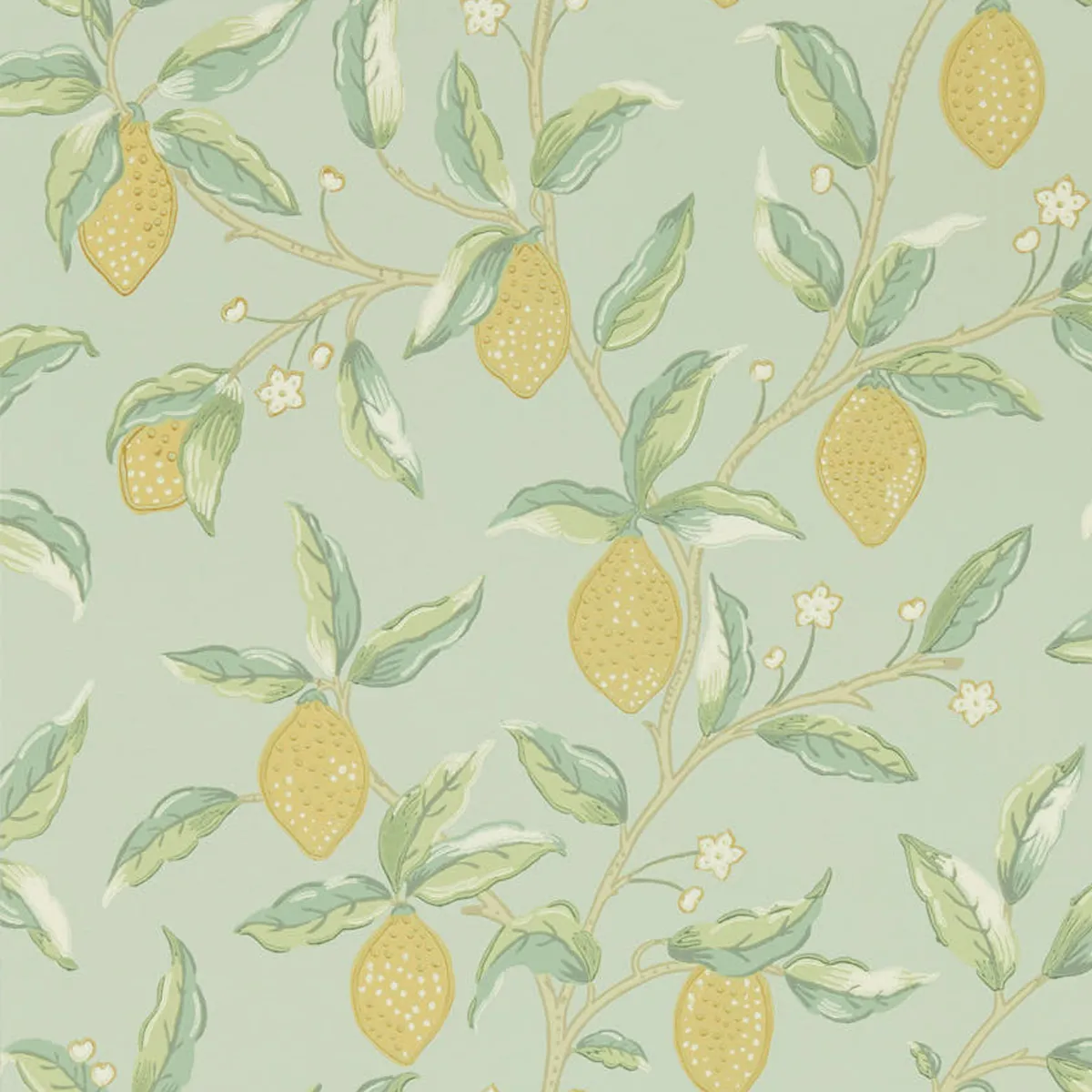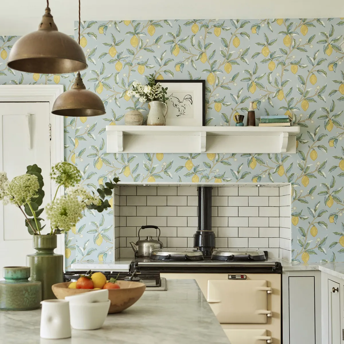 The Lemon Tree wallpaper with fresh lemons from Morris & Co is available in three color options. The wallpaper is suitable for kitchens and dining rooms.