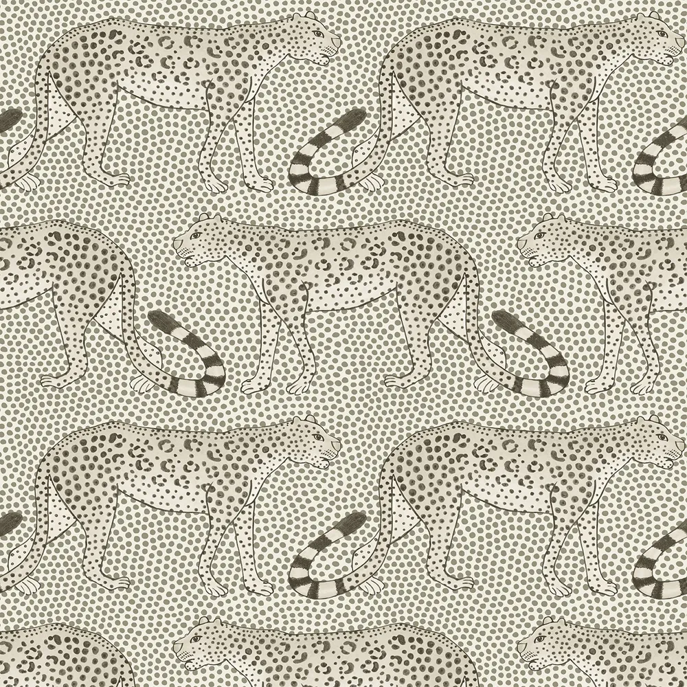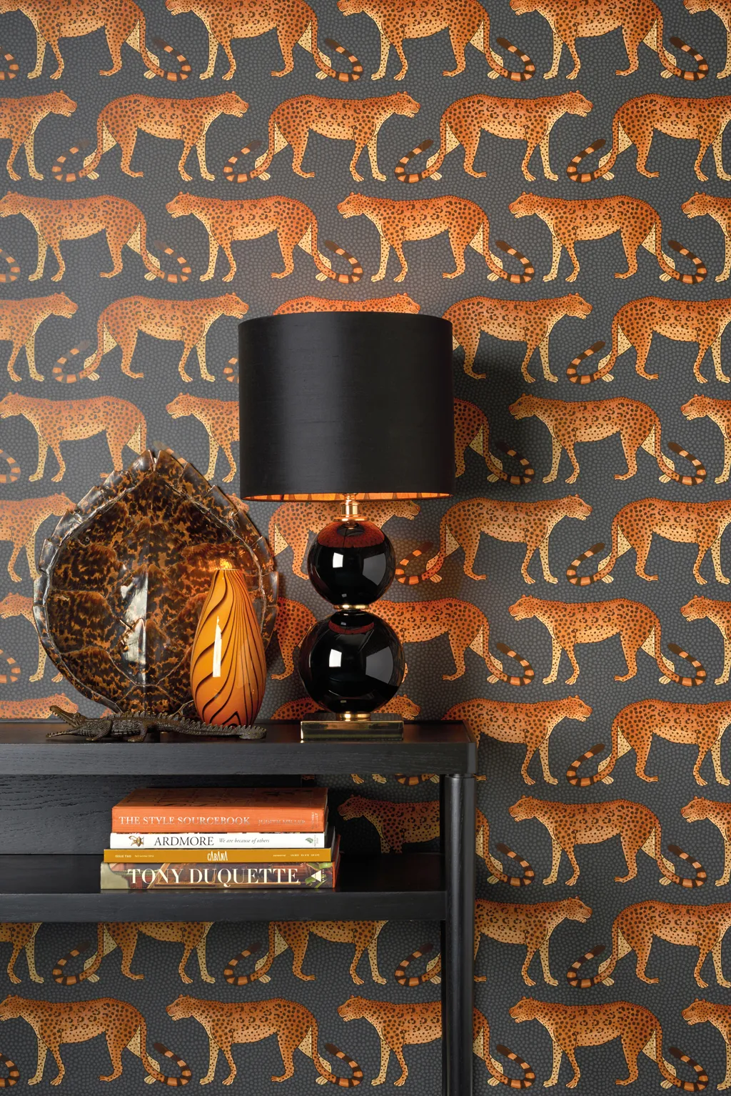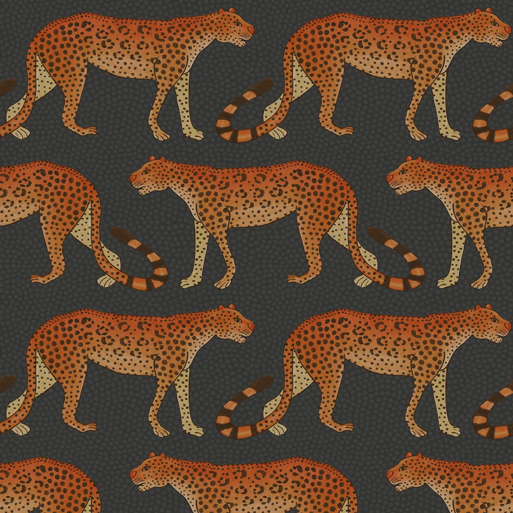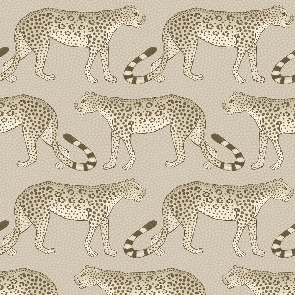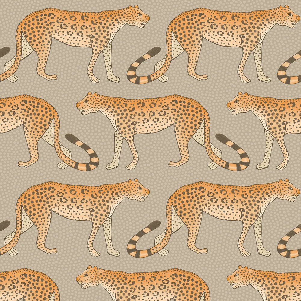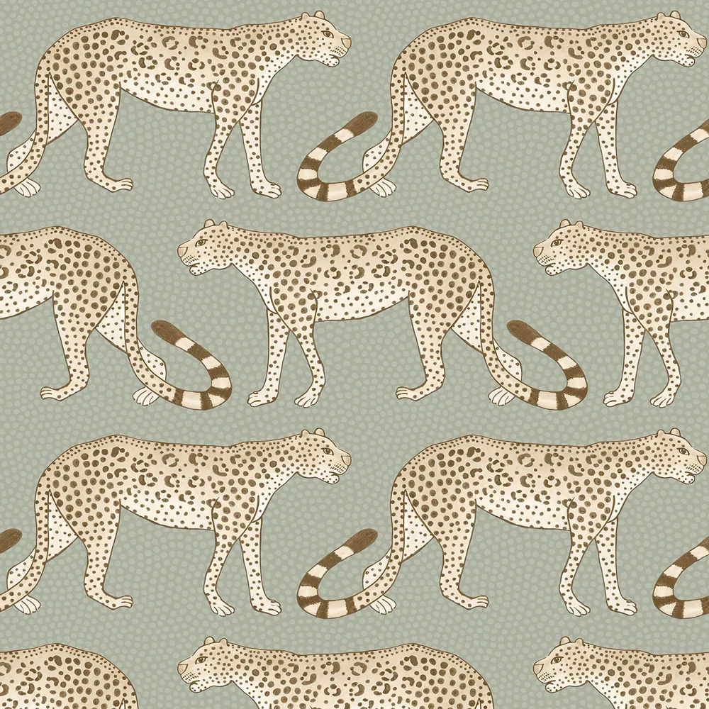 The Leopard Walk animal wallpaper featuring majestic leopards marching in a row is a fun wallpaper with a regular pattern. The wallpaper is suitable for the living room, dining room, children's room, or why not the home office.