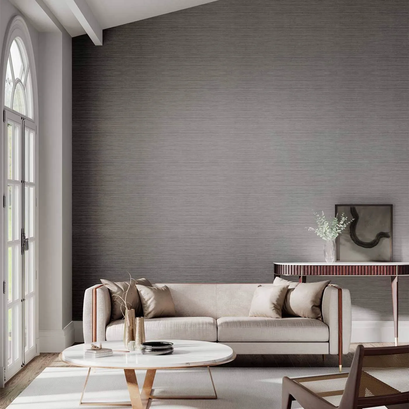 Harlequin's Oralia is a beautiful vinyl wallpaper that is almost solid in color. The beautiful wallpaper has a striped pattern that can be felt with the fingers.