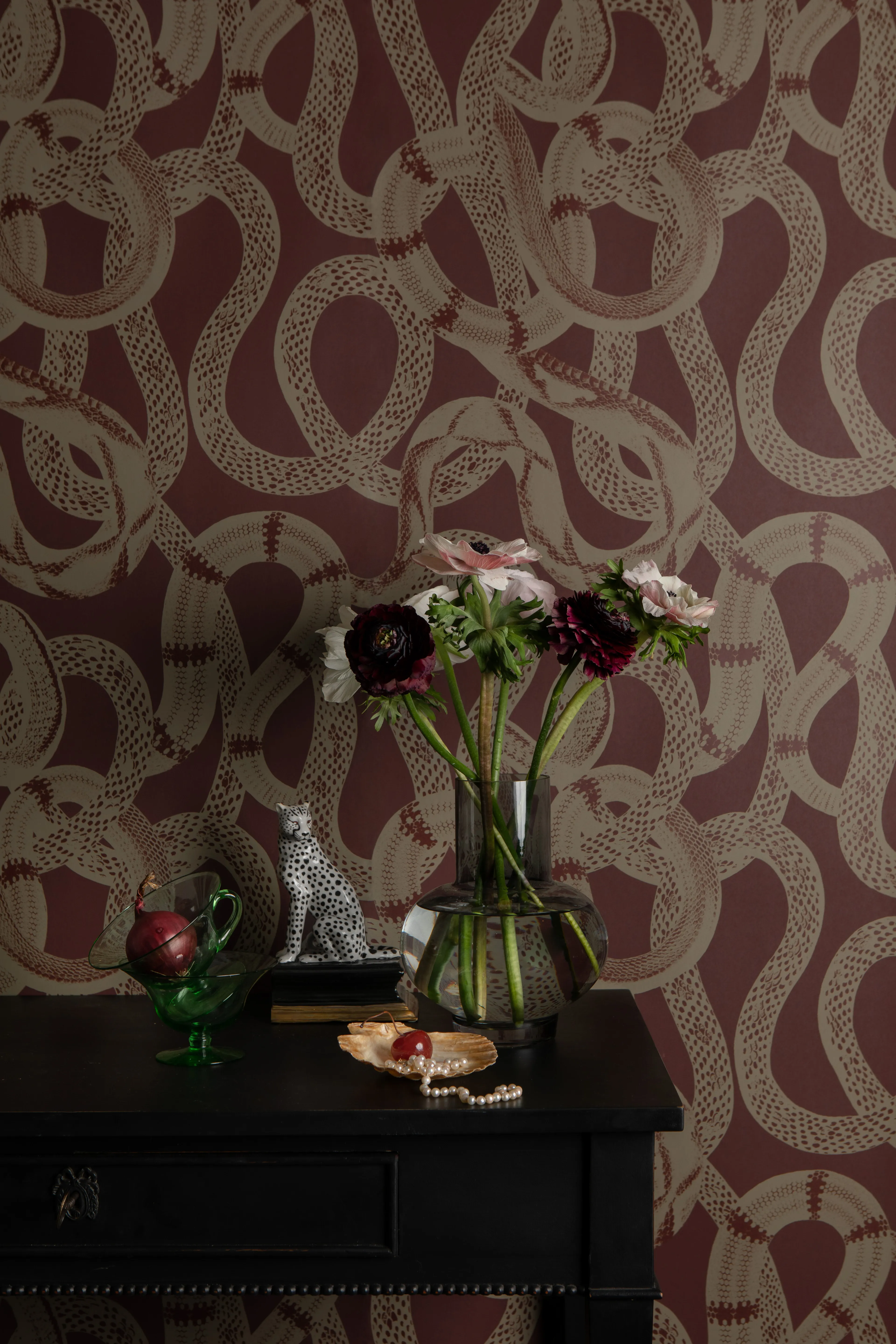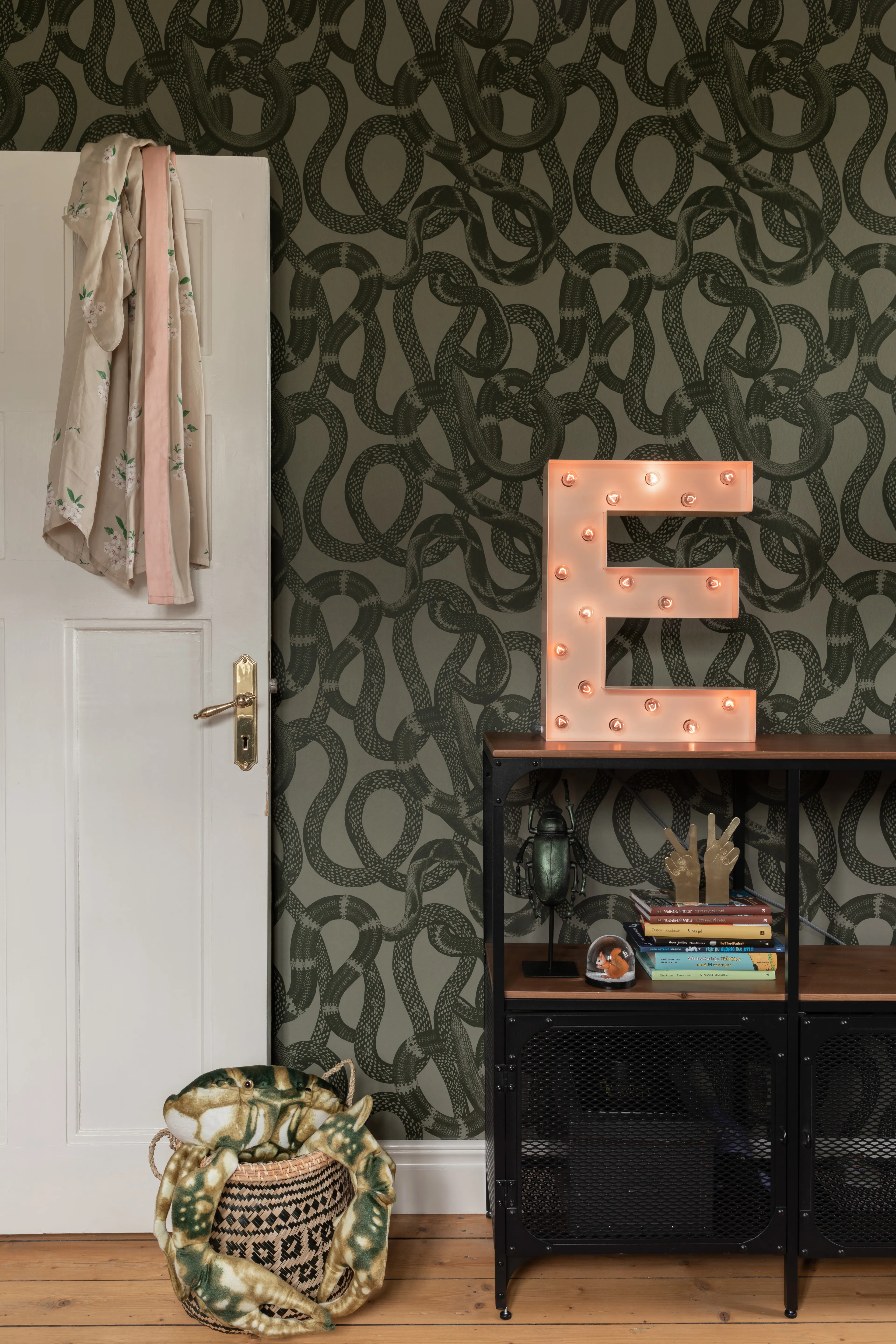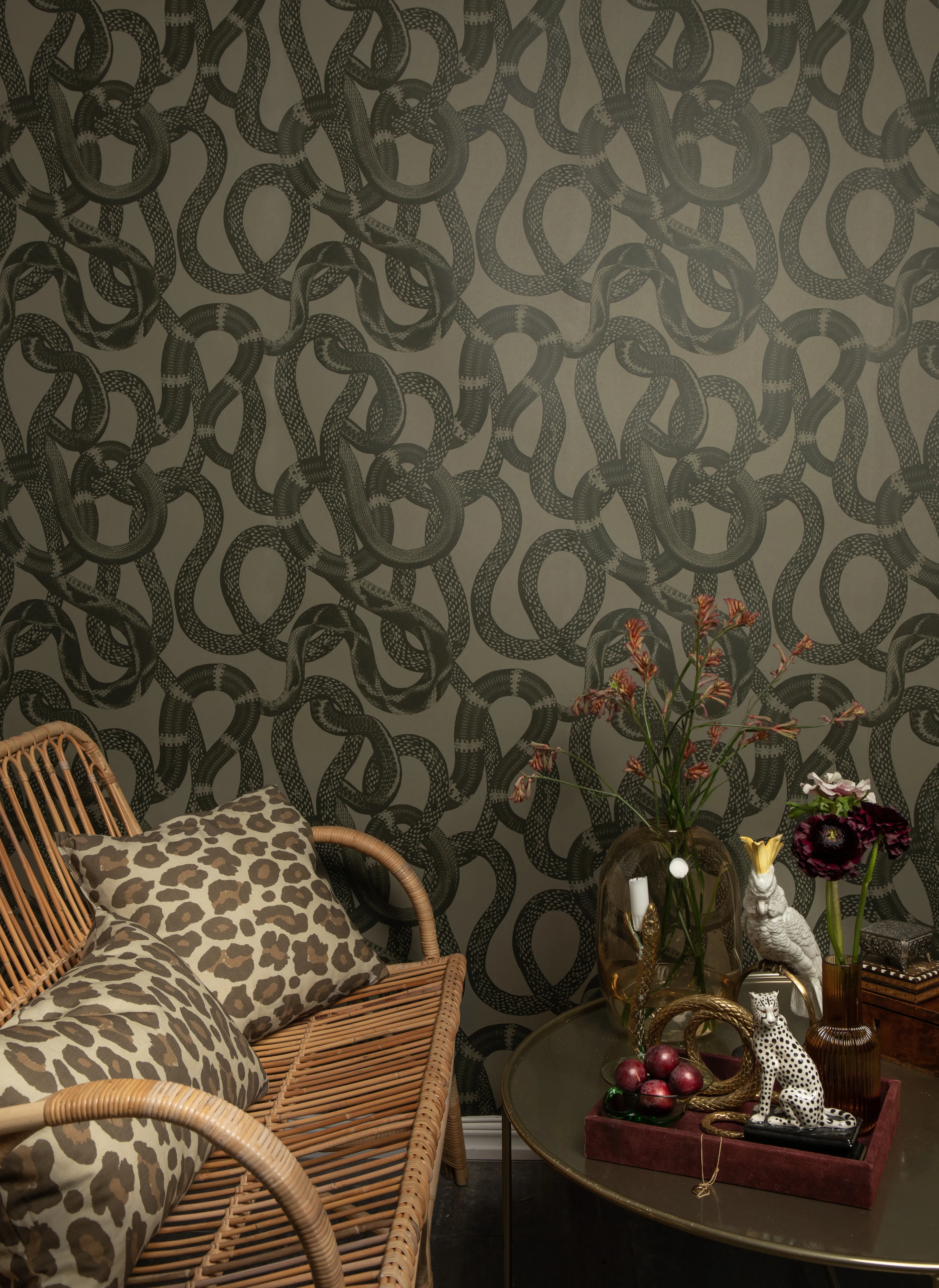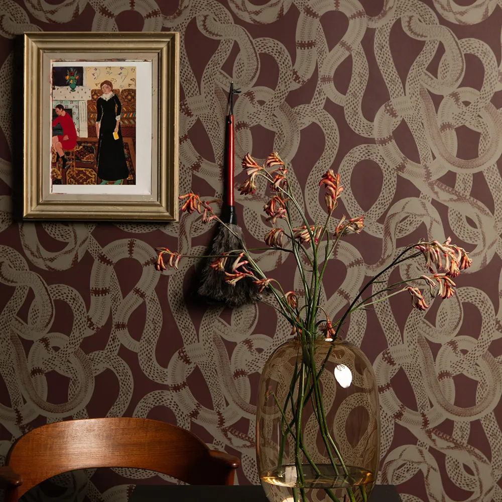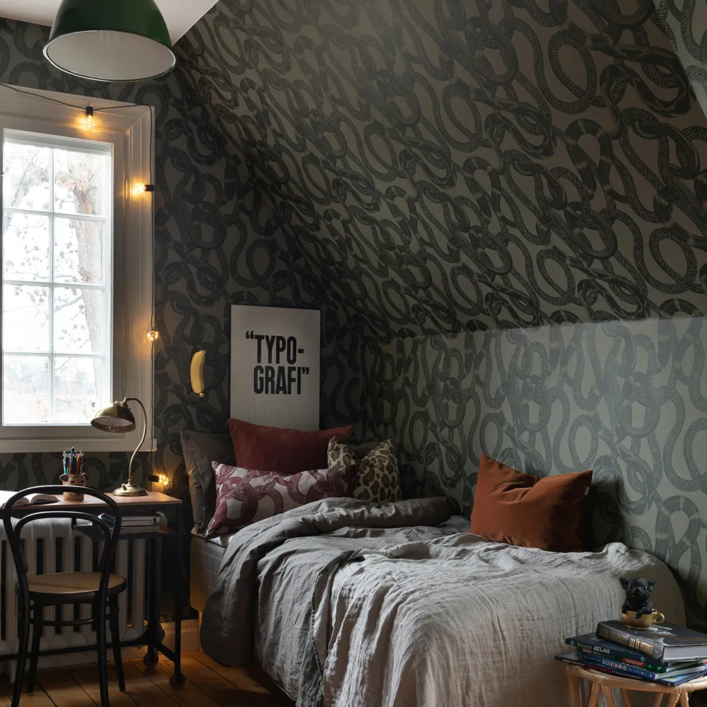 The wallpaper Snake Peek is tough and exciting with slithering snakes. A perfect wallpaper for the cool teenage son's room, or as an exclamation point in the hallway, guest bathroom, or living room.