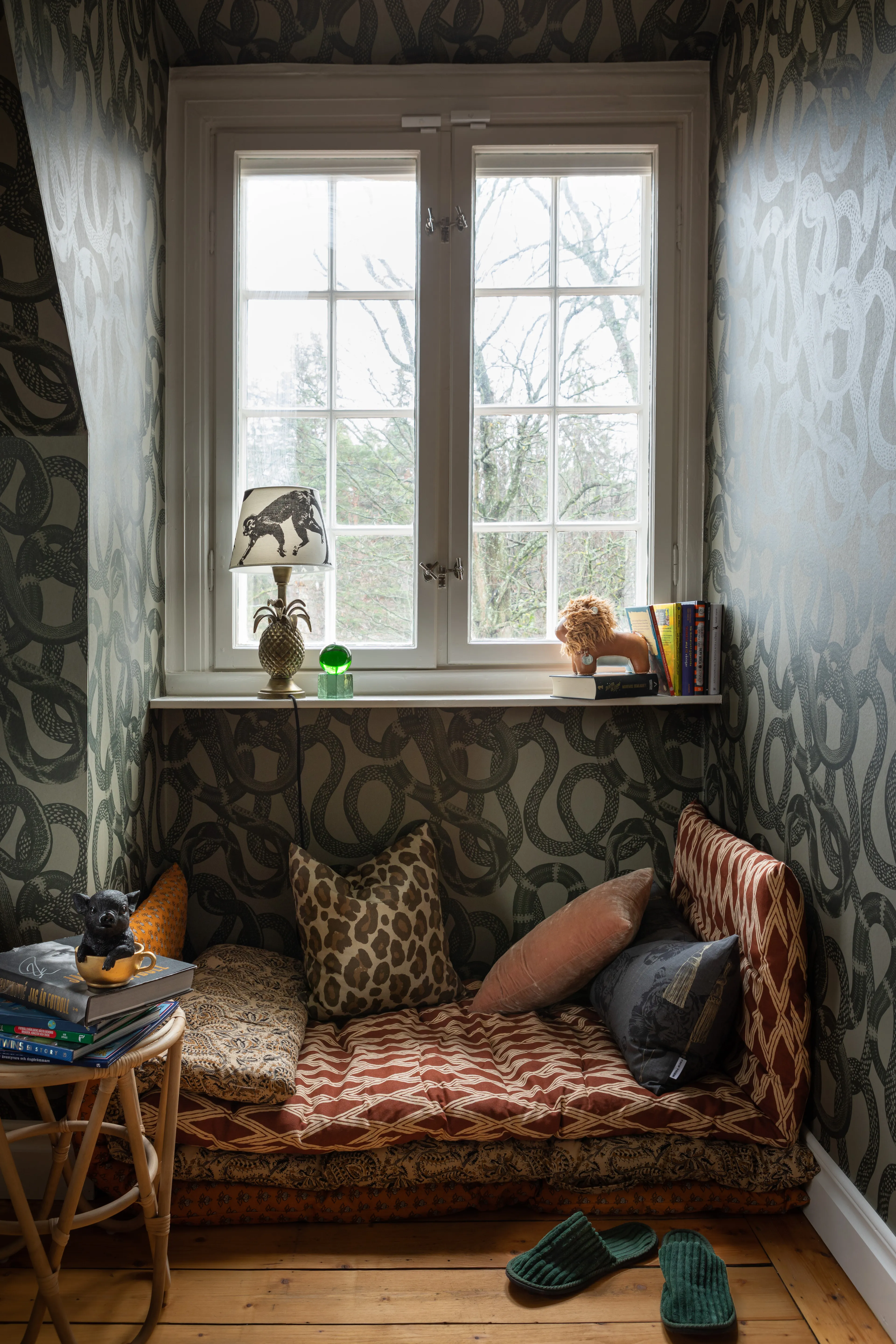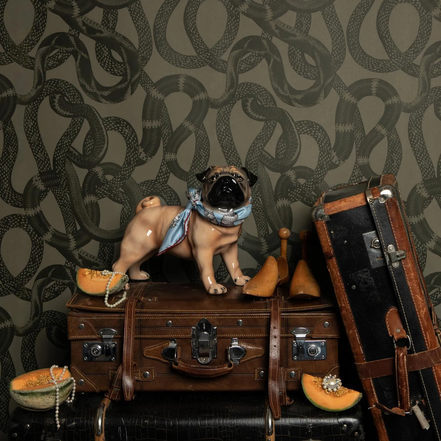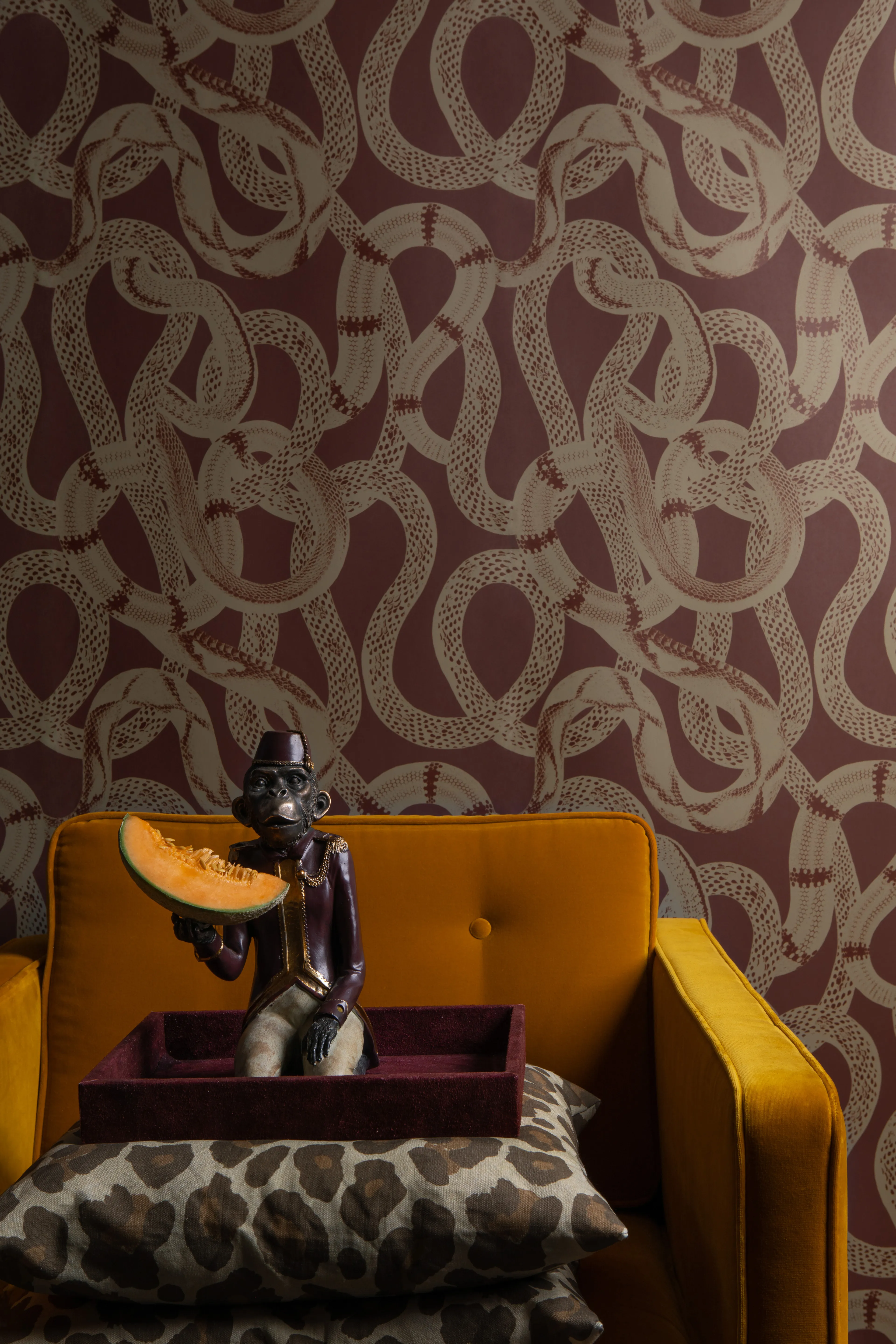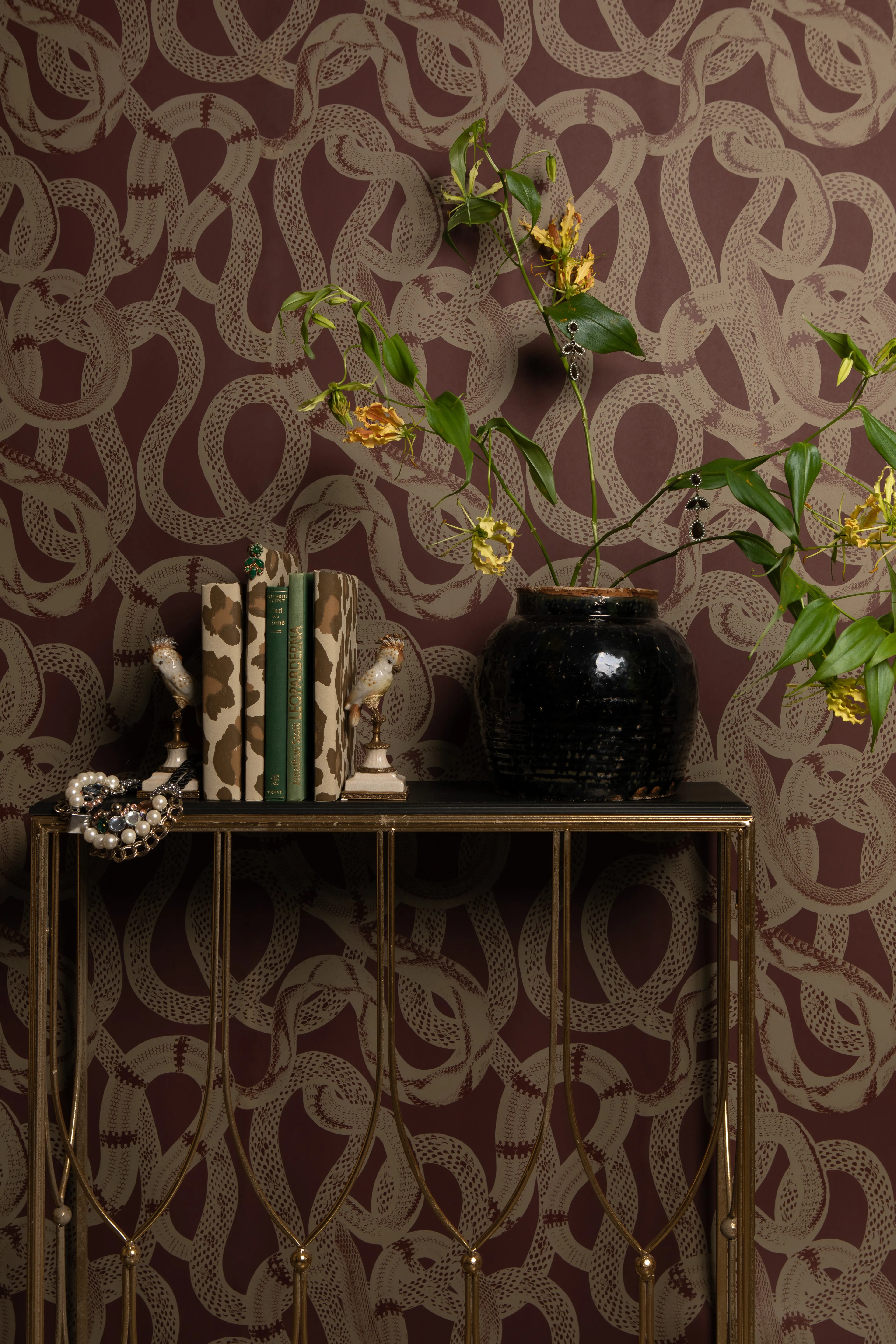 The wallpaper Snake Peek is tough and exciting with slithering snakes. A perfect wallpaper for the cool teenage son's room, or as an exclamation point in the hallway, guest bathroom, or living room.
