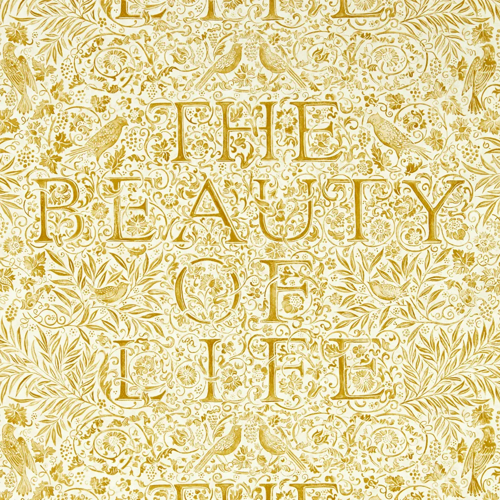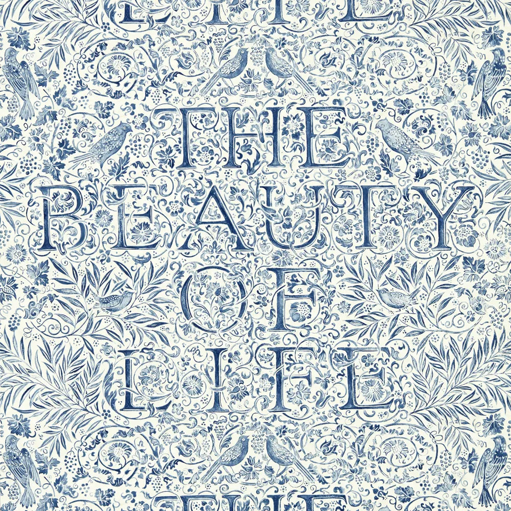 The wallpaper The Beauty of Life has been inspired by the title of William Morris's lecture from 1880 in which he protested against industrialized capitalism. The font in the text The Beauty of Life is inspired by Morris's own printing press, The Kelmscott Press, which he realized with the support of his friend Emery Walker. The text is surrounded by birds, foliage, and flowers characteristic of William Morris's patterns. The wallpaper is suitable as a feature wall in kitchens and dining rooms, bedrooms, and living rooms.