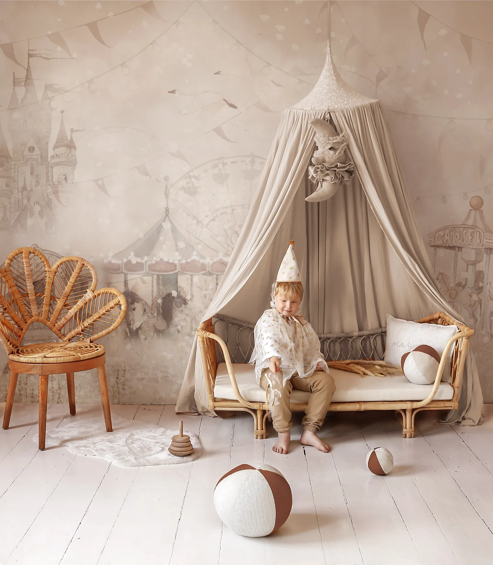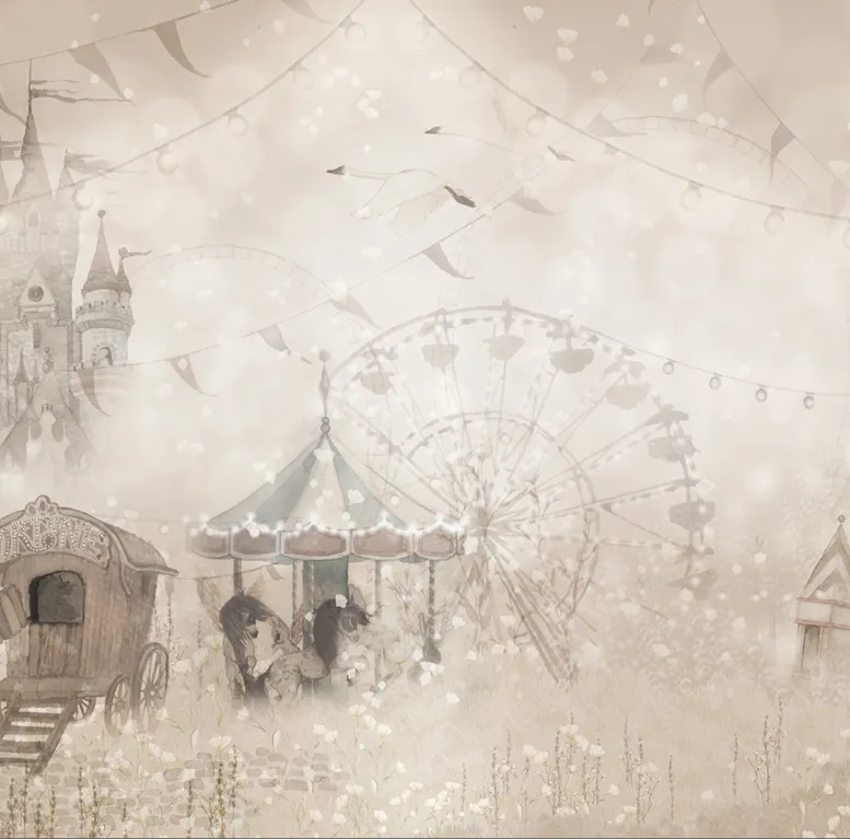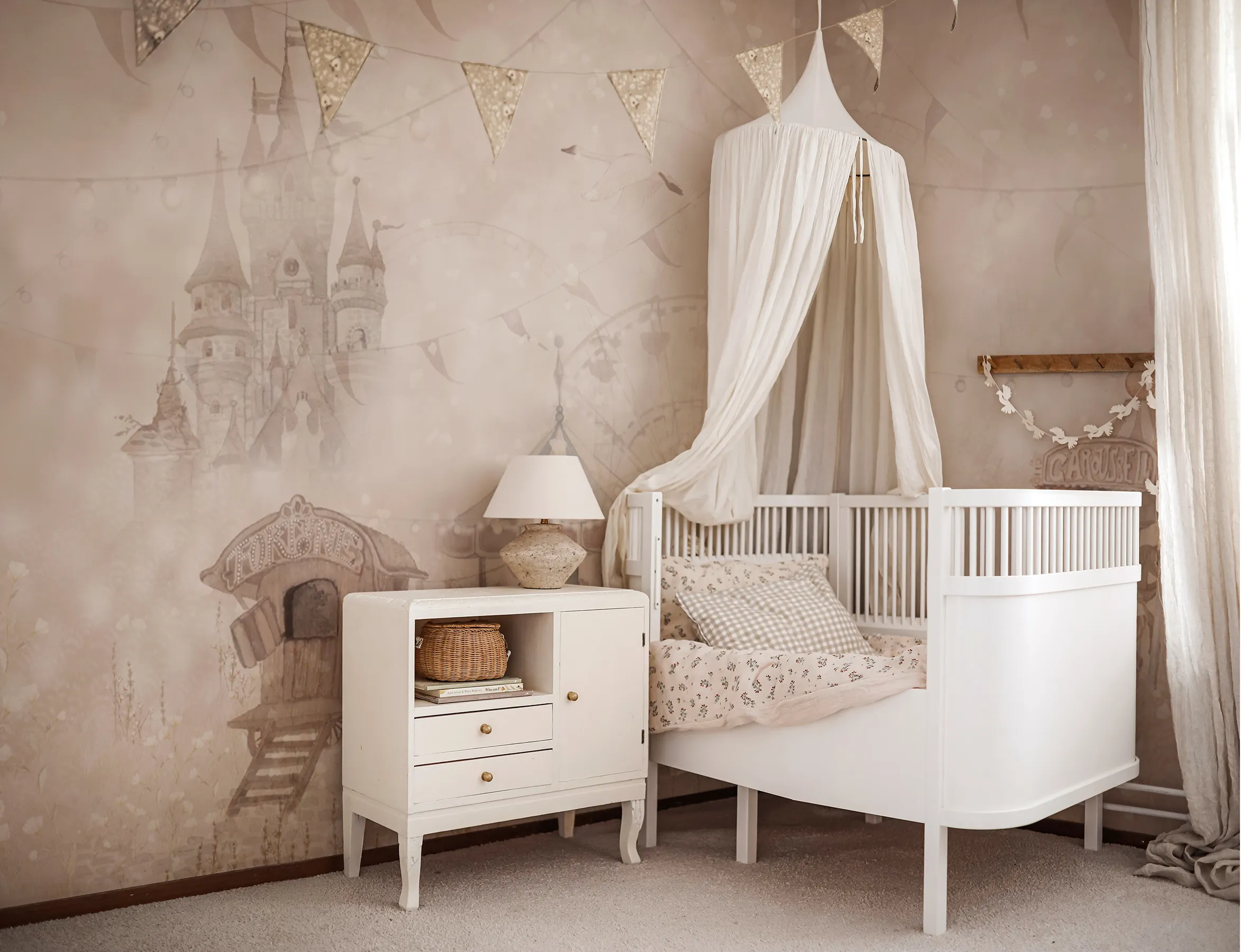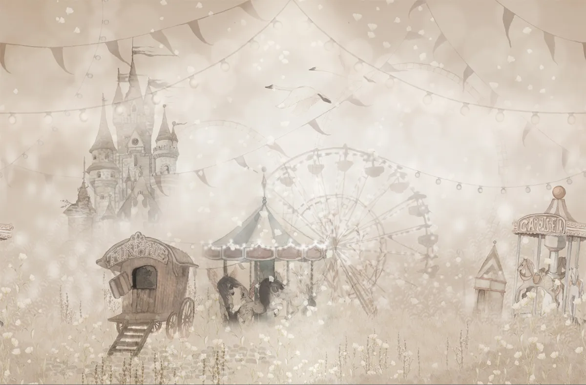 The large-scale wallpaper The Forgotten Tivoli becomes like a huge mural in your room and transforms the children's room into a magical place. Imagine waking up day after day in a fairy tale world. A vintage-style tivoli with fluttering flags, fairy tale castles, and carousels sweetly blends with soft pink tones. Welcome to The Forgotten Tivoli, a place where fantasy meets reality and creates unforgettable memories every day.
