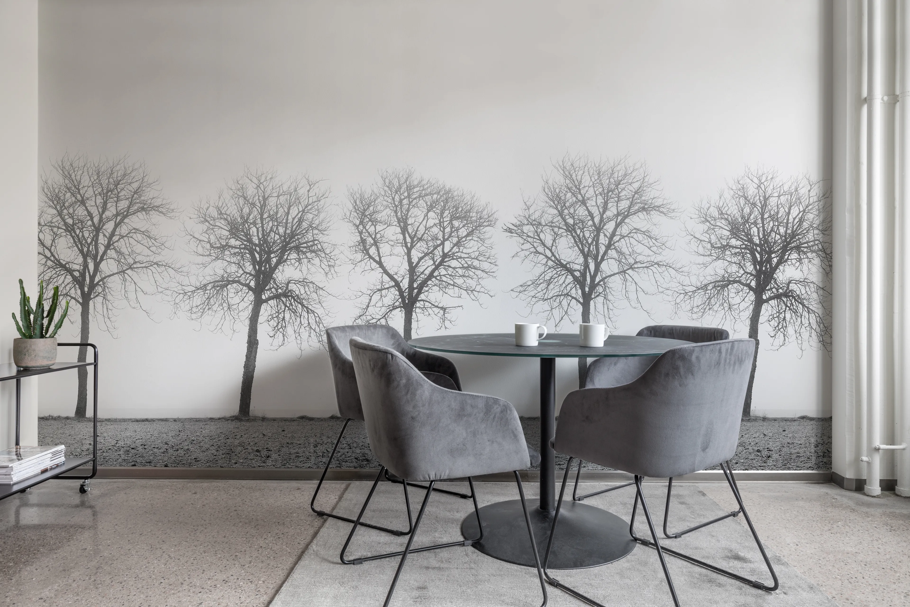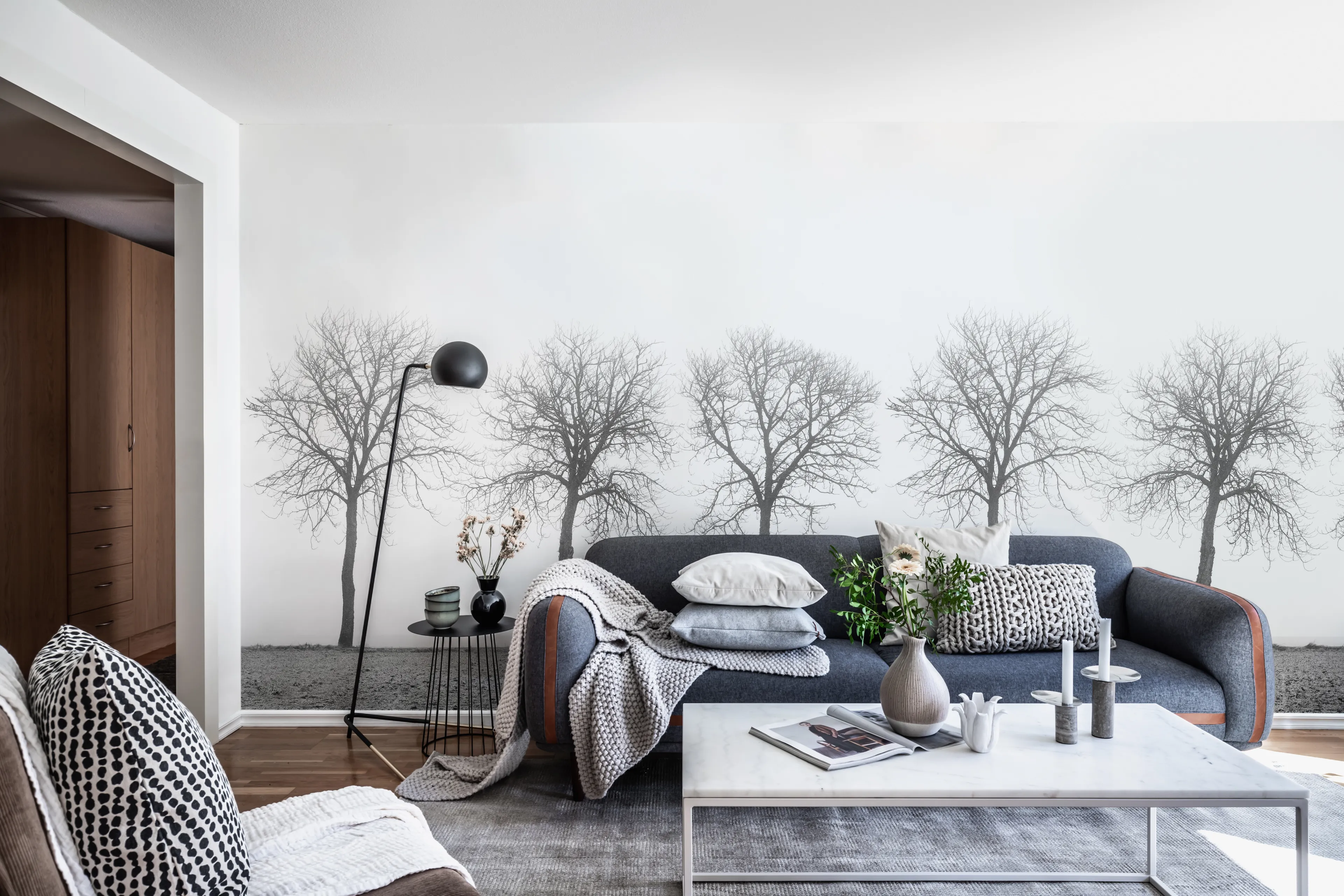 Muraltapeten Tree Soldiers is a black and white, elegant photo wallpaper with three bare trees standing proudly in the mist. A stylish mural wallpaper for the kitchen or living room.