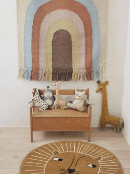 OYOY:s populära barnmattor med djurmotiv gör varje barnrum roligt att leka i. Lion-mattan är en favorit. Rainbow-regnbågsmattan har fått en kompis i söta väggbonaden Follow the Rainbow.