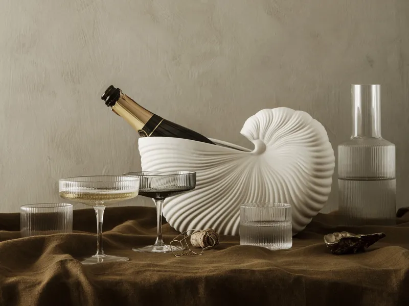 Ferm Livings populära Shell-kruka kan användas som en dryckeskylare och drycken kan avnjutas i Ripple-champagneglasen eller låga Ripple-glasen. Perfekta julklappar som höjer temperaturen inför nyårsfirandet!
