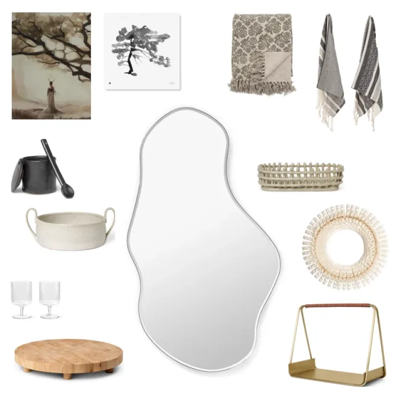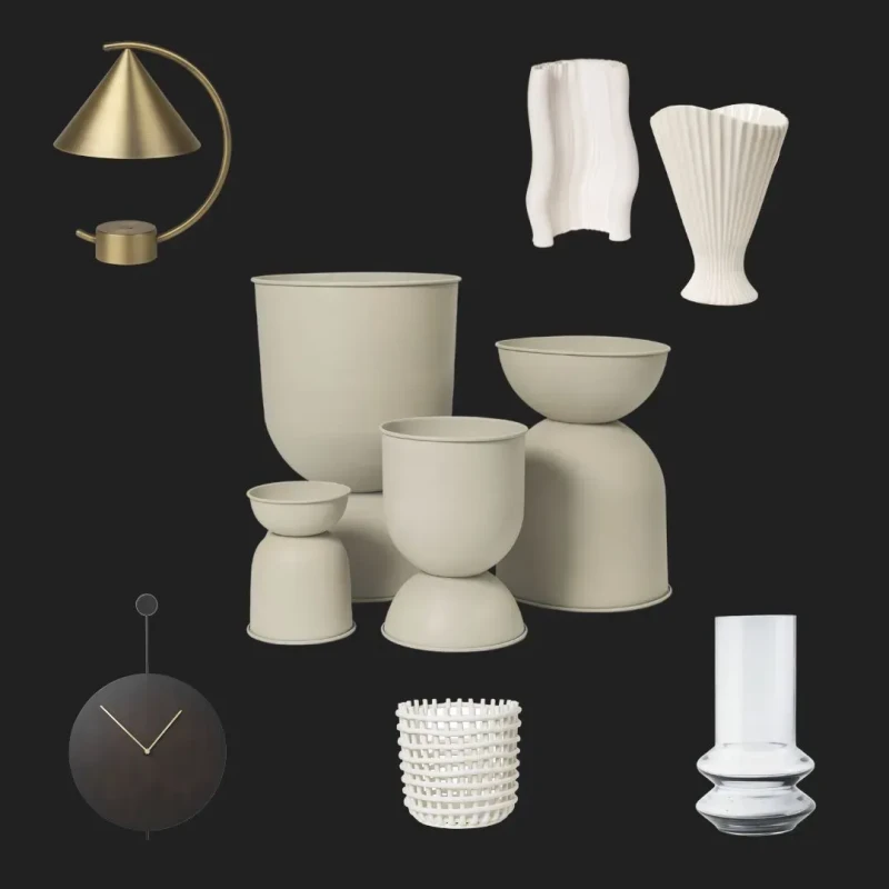 Burken Flow med lock och sked (kan användas för till exempel salt, socker eller sylt) och skålen Flow Centrepiece som kan användas för sallad eller frukt. Populära spegeln Pond finns i tre storlekar och med mässingskant eller kromkant. Ovala korgen Ceramic Basket. Vinglasen Ripple kommer i tvåpack. Skärbrädan Chess finns i två storlekar, och också i rektangulär form. Vedkorgen Port finns i mässingsfärg och svart. Samtliga från Ferm Living.