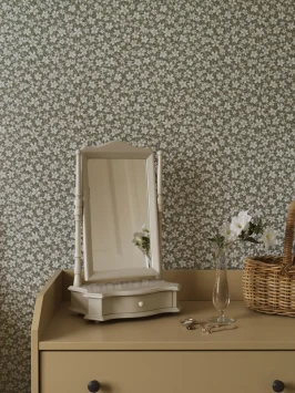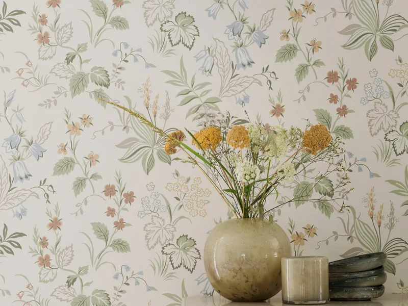Småblommiga tapeten Skogsblomst är harmonisk och passar bra till exempel i sovrummet som blir härligt ombonat. Tre färgalternativ.