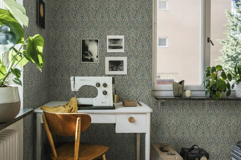 Tapeten Lindskog har ett tätt mönster av blommor och blad. Tapeten är lugn och harmonisk och fås i tre färger.