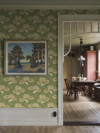 I början av 1900-talet dominerade jugendstilen och naturinspirerade mönster. Ett exempel är storblommiga Haga (bild ovan) med näckrosor i ett graciöst mönster. Den andra jugendtapeten i kollektionen är Villastan, med ett stramt och grafiskt mönster.