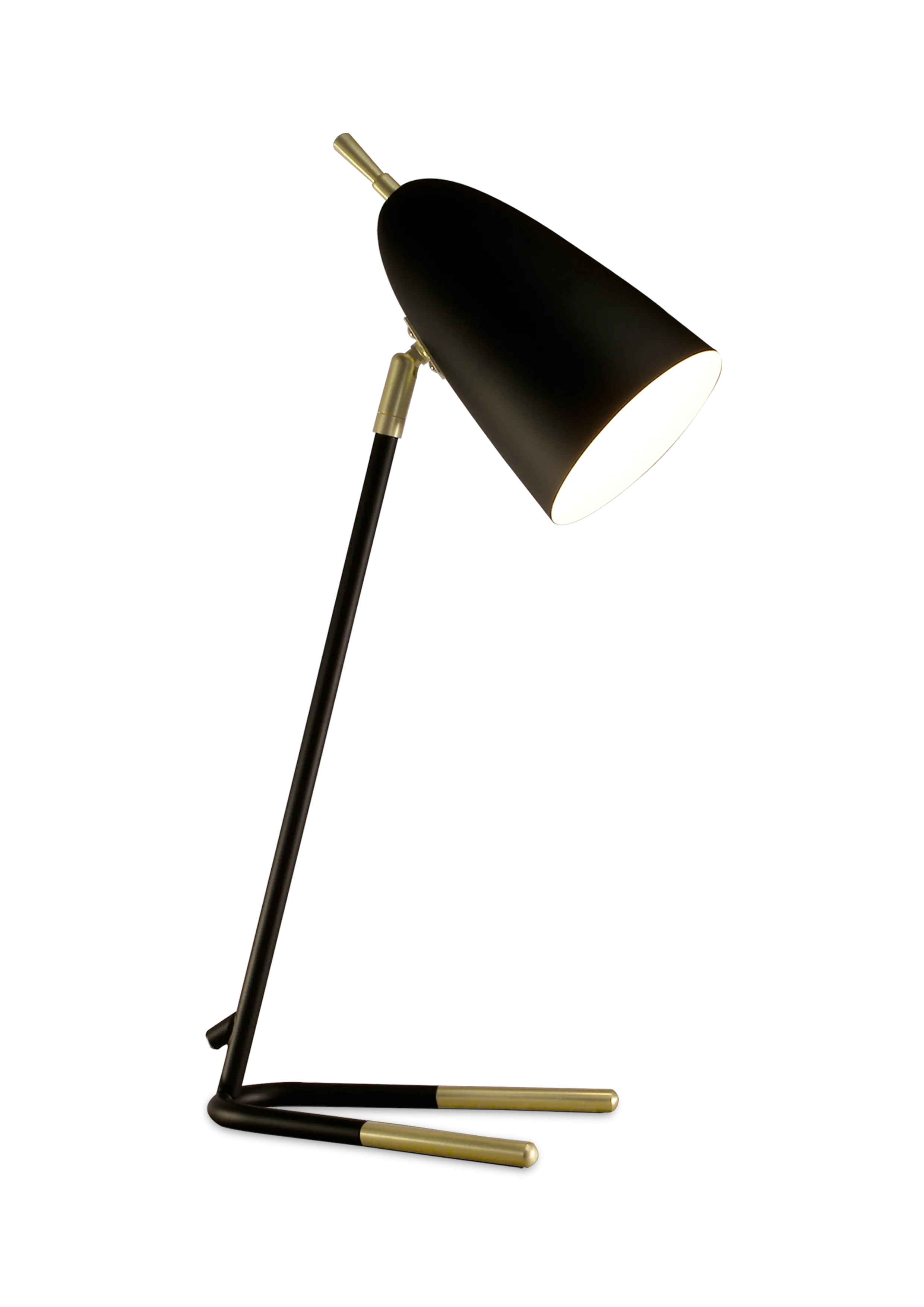 Aiden modern bordslampa från Sessak. Den vackra bordslampan finns i svart eller vitt med mässingsdetaljer.