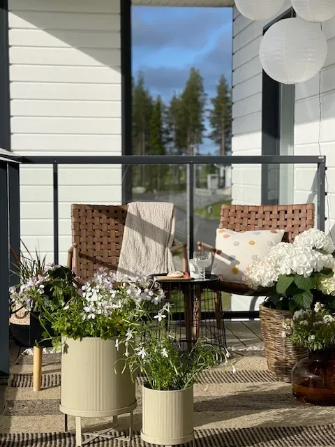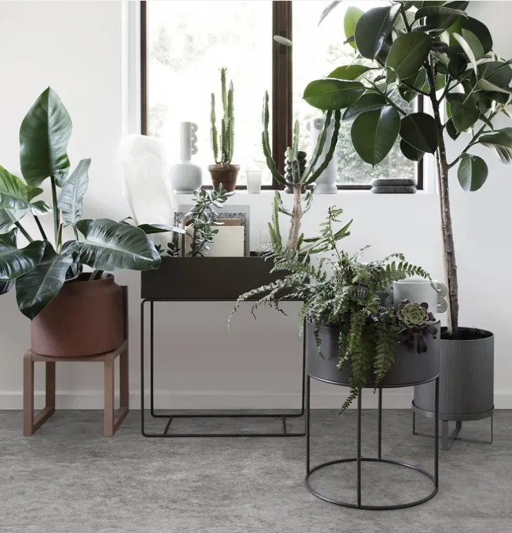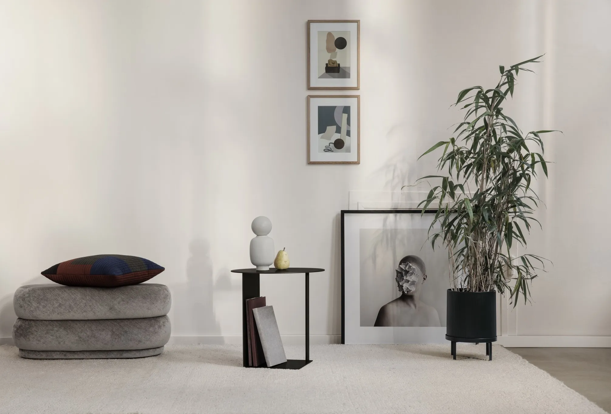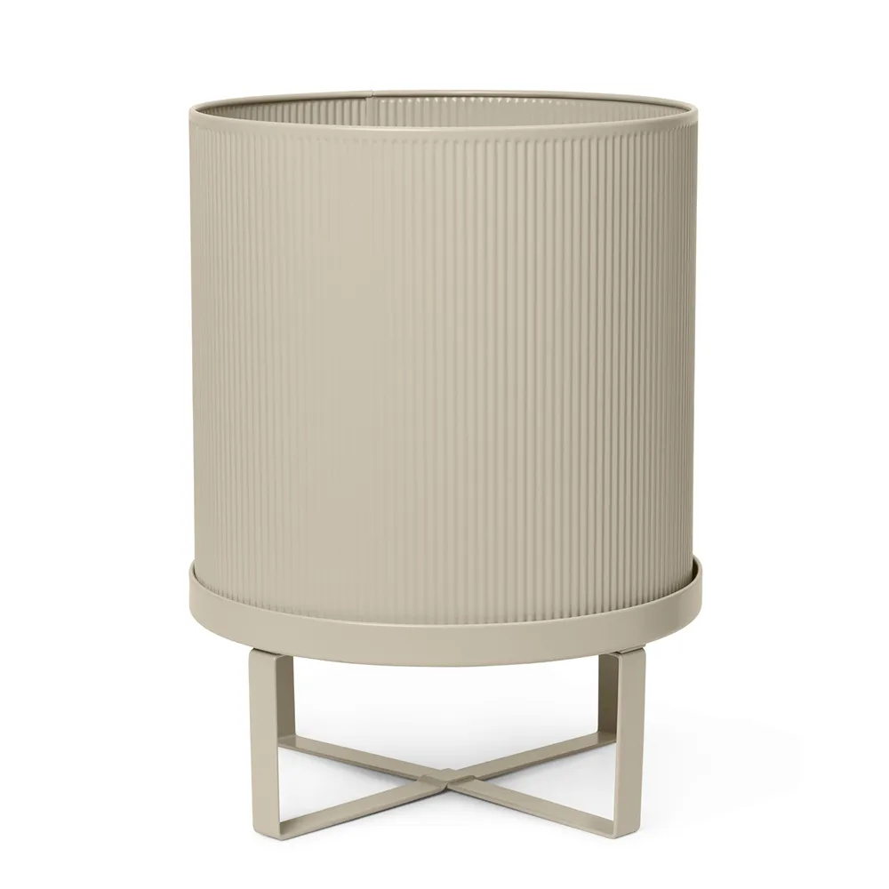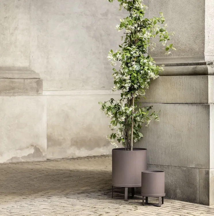 Ferm Living stora kruka Bau Pot Large är snygg och stilren. Krukan, som står på en ställning, har dräneringshål i botten. Den kan användas också inomhus men då som täckande ytterkruka eller snygg förvaring.