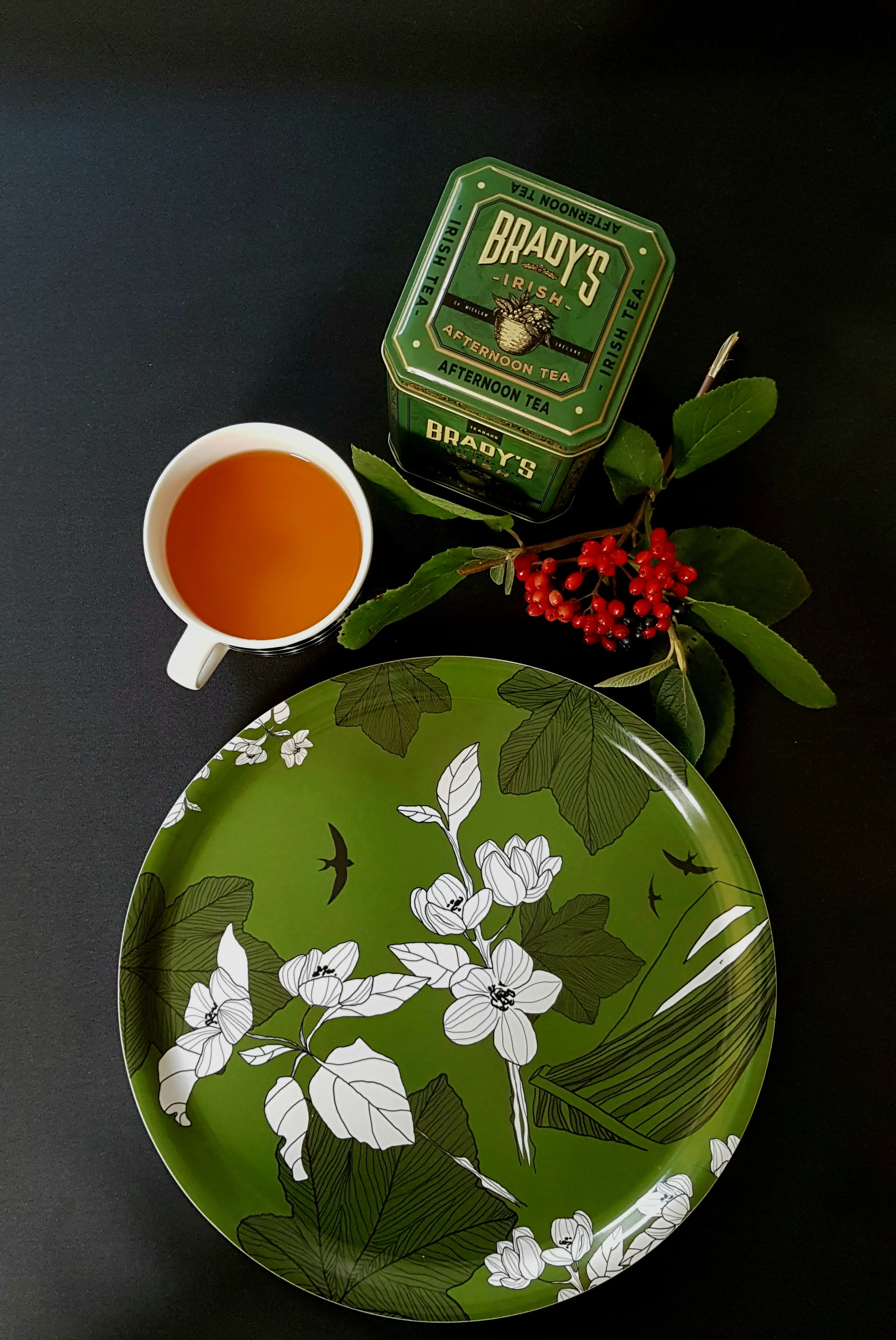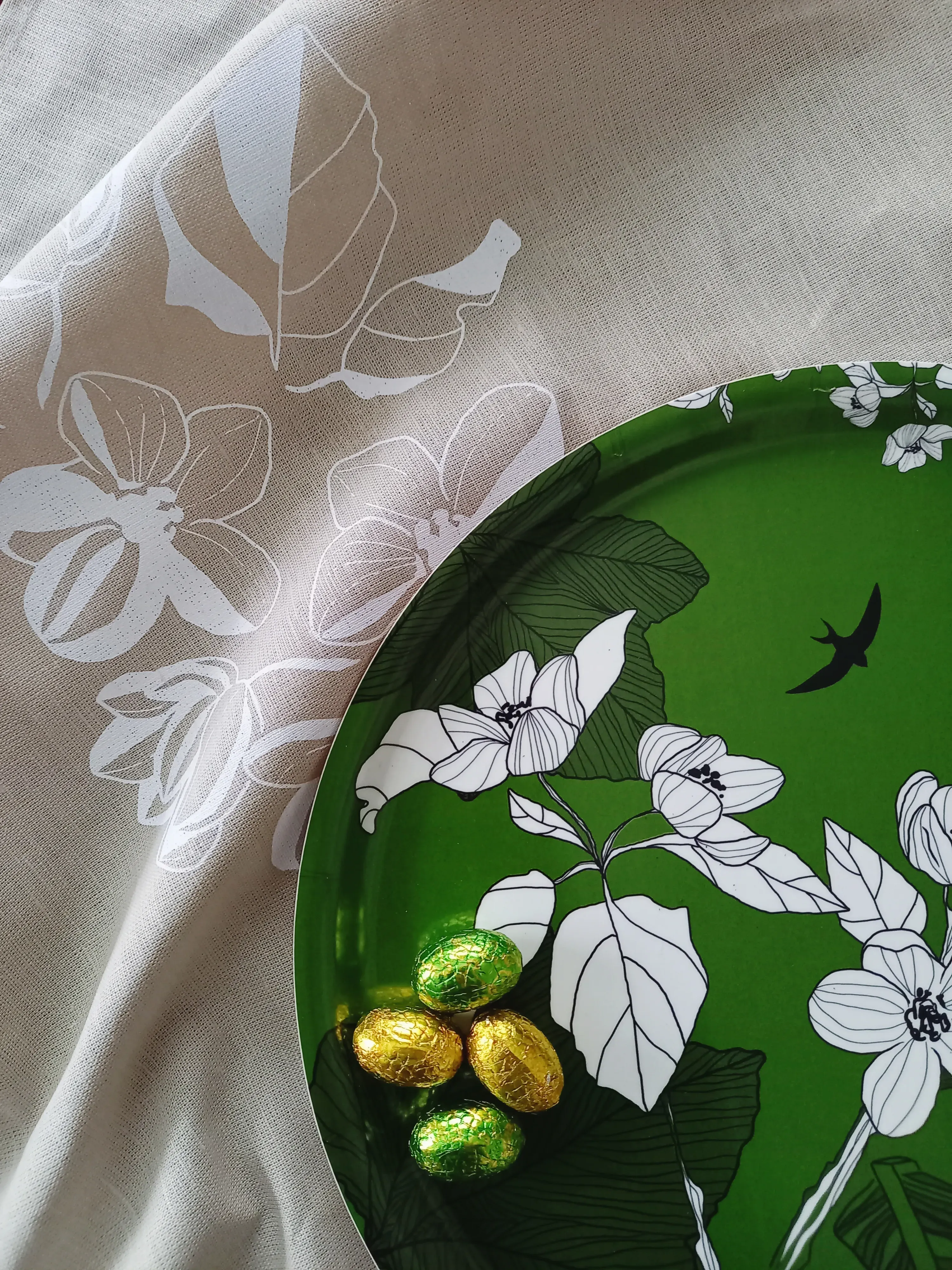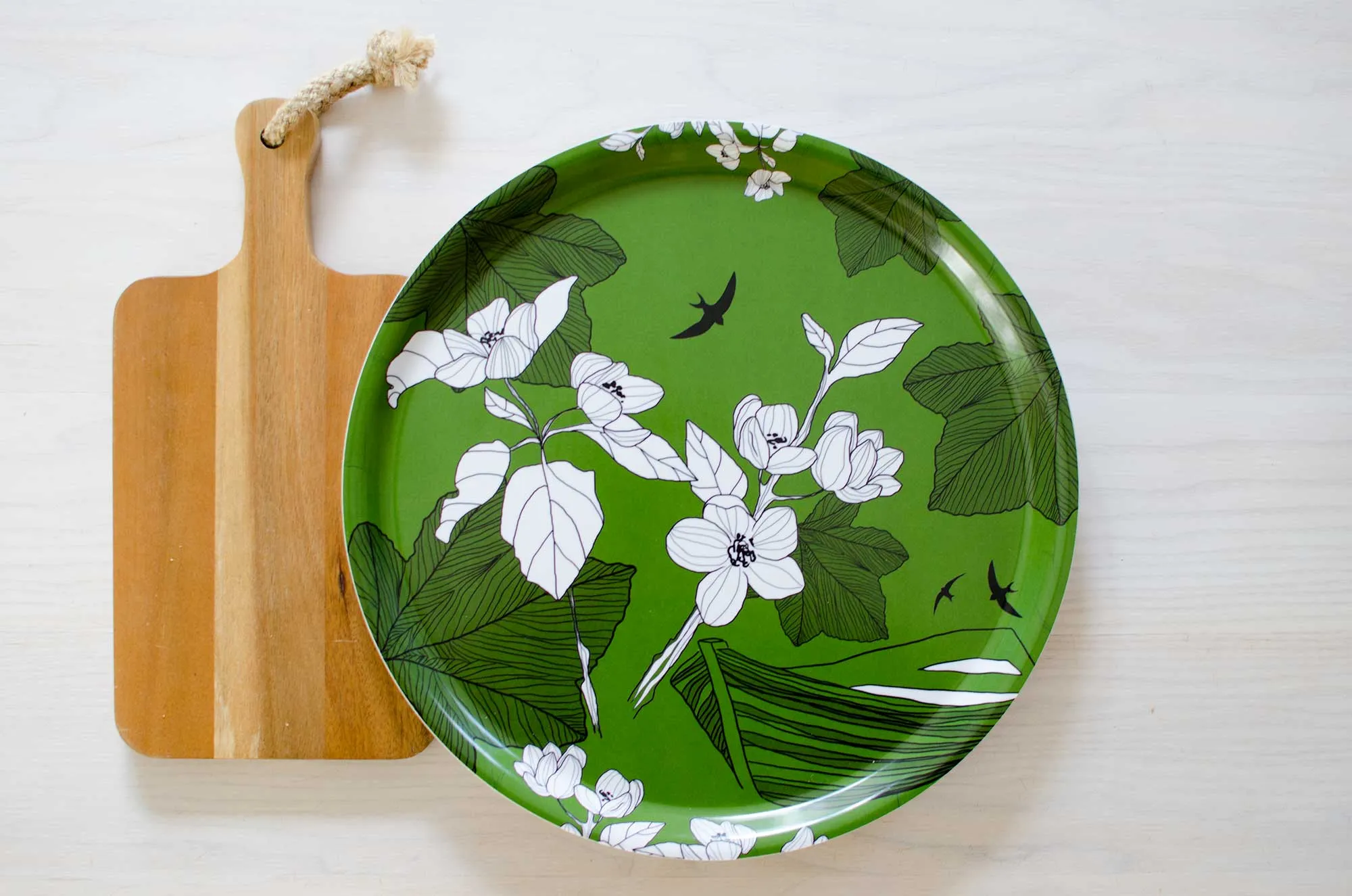 Den blåa brickan, som nu utgått ur sortimentet, står för närheten till havet. Den blåa lyfter träbåten som finns i alla brickor och samtidigt får svalorna en blå himmel att segla på.