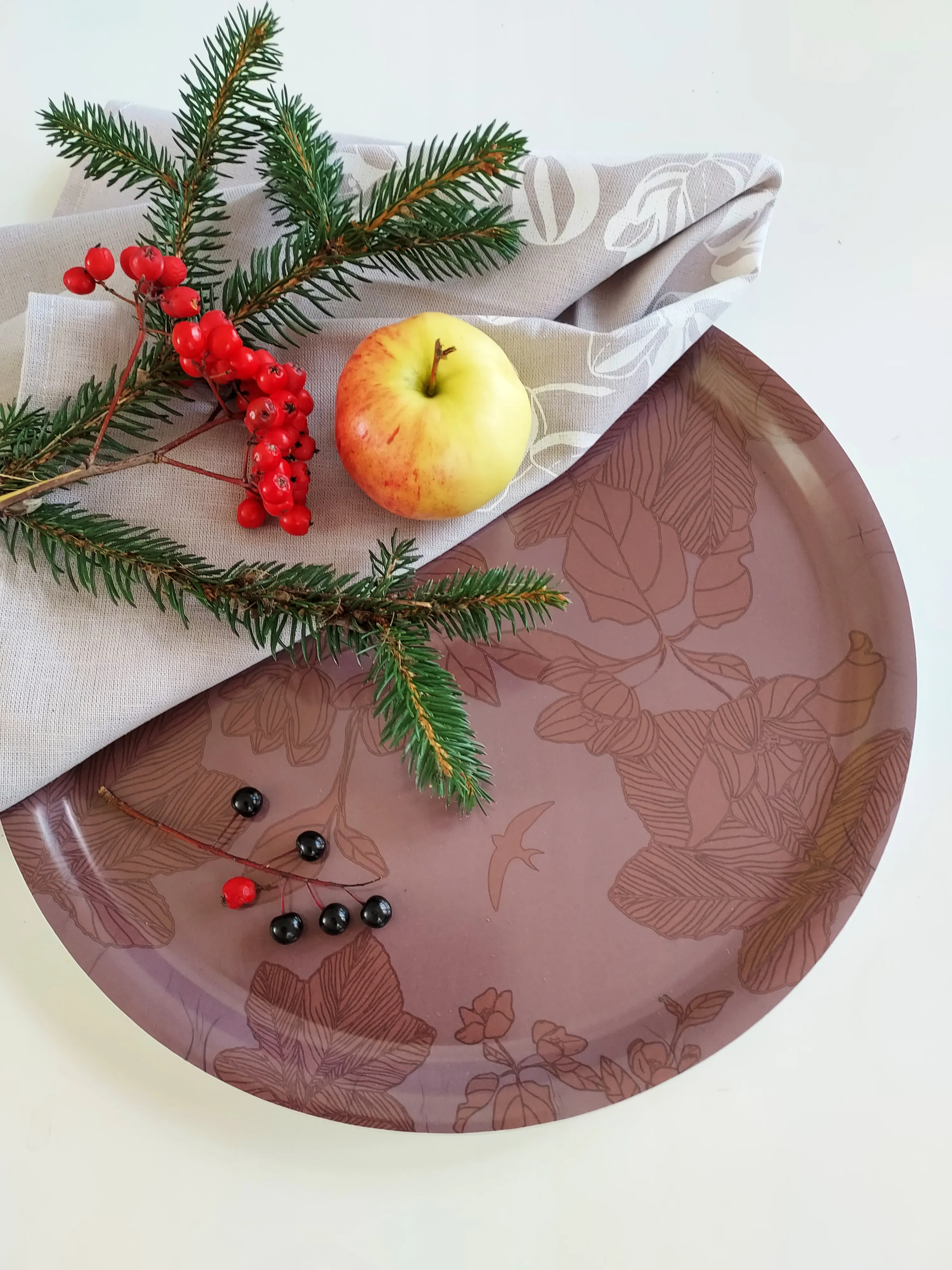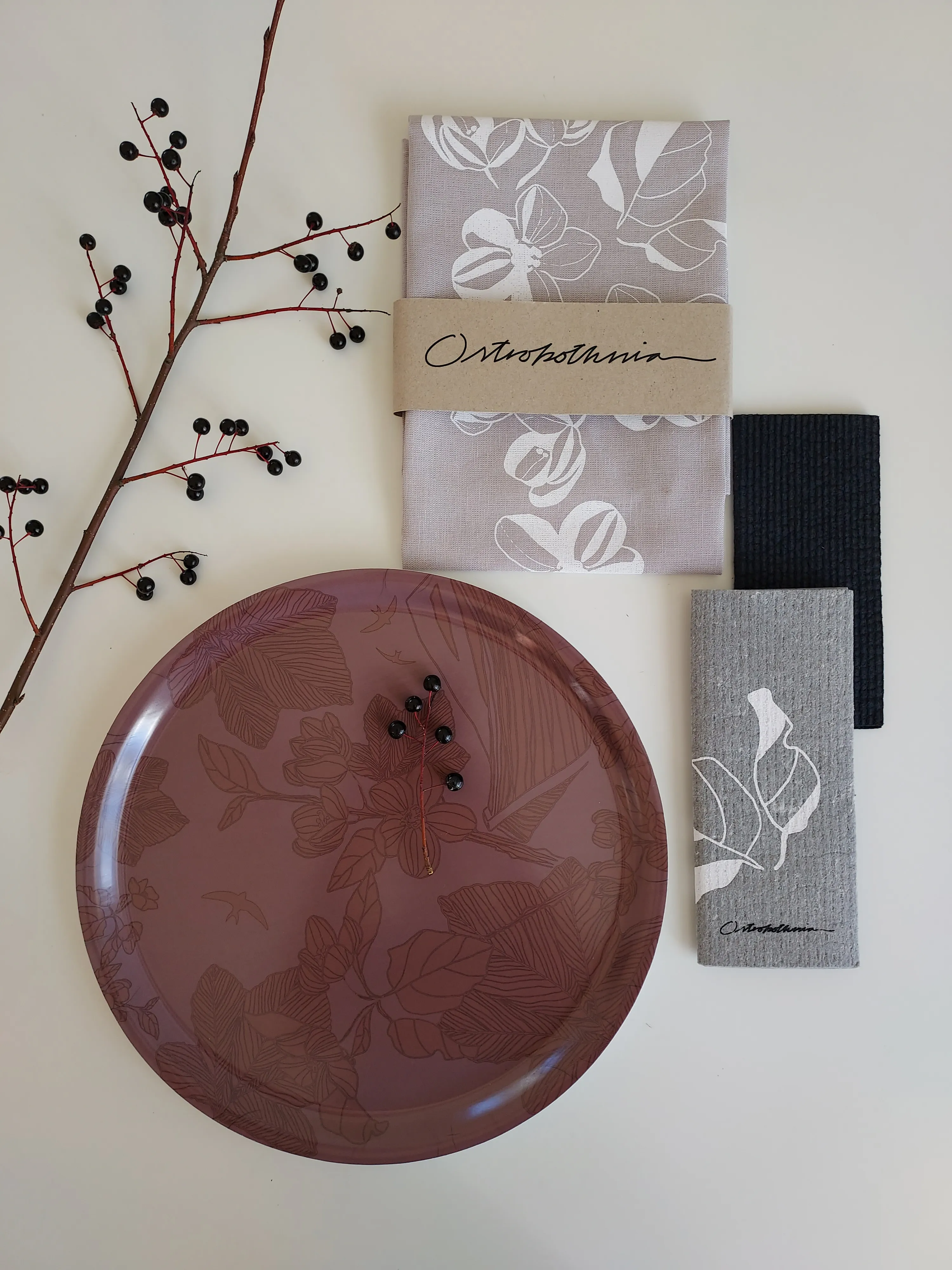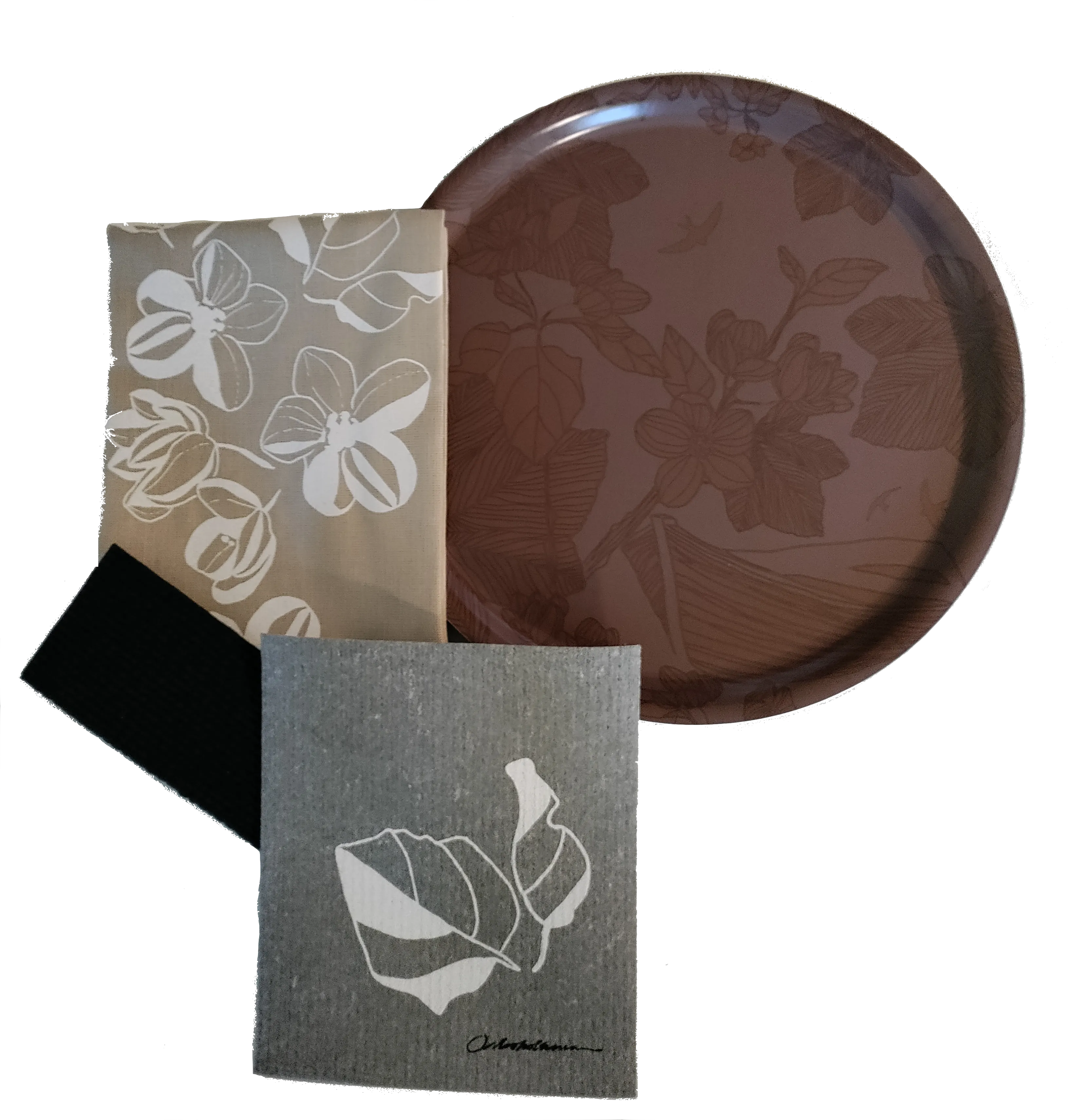 Julklapp från Österbotten - rostbruna Österbottenbrickan kombinerat med beige kökshandduken Äppelblom samt en grå och en svart disktrasa. Ostrobothnia julpaket passar inte bara för familjemedlemmar, utan också för företagsanställda, samarbetspartners och kunder. Ge som gåva året runt varaktig julglädje!