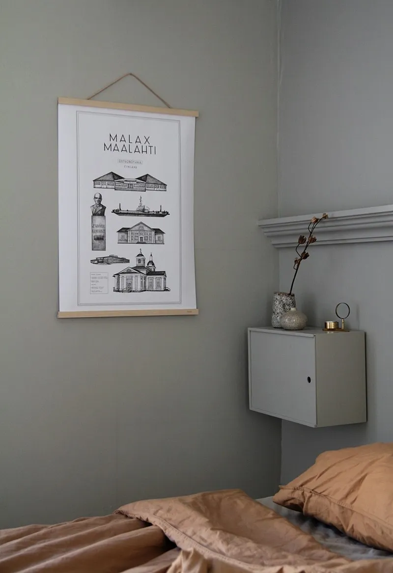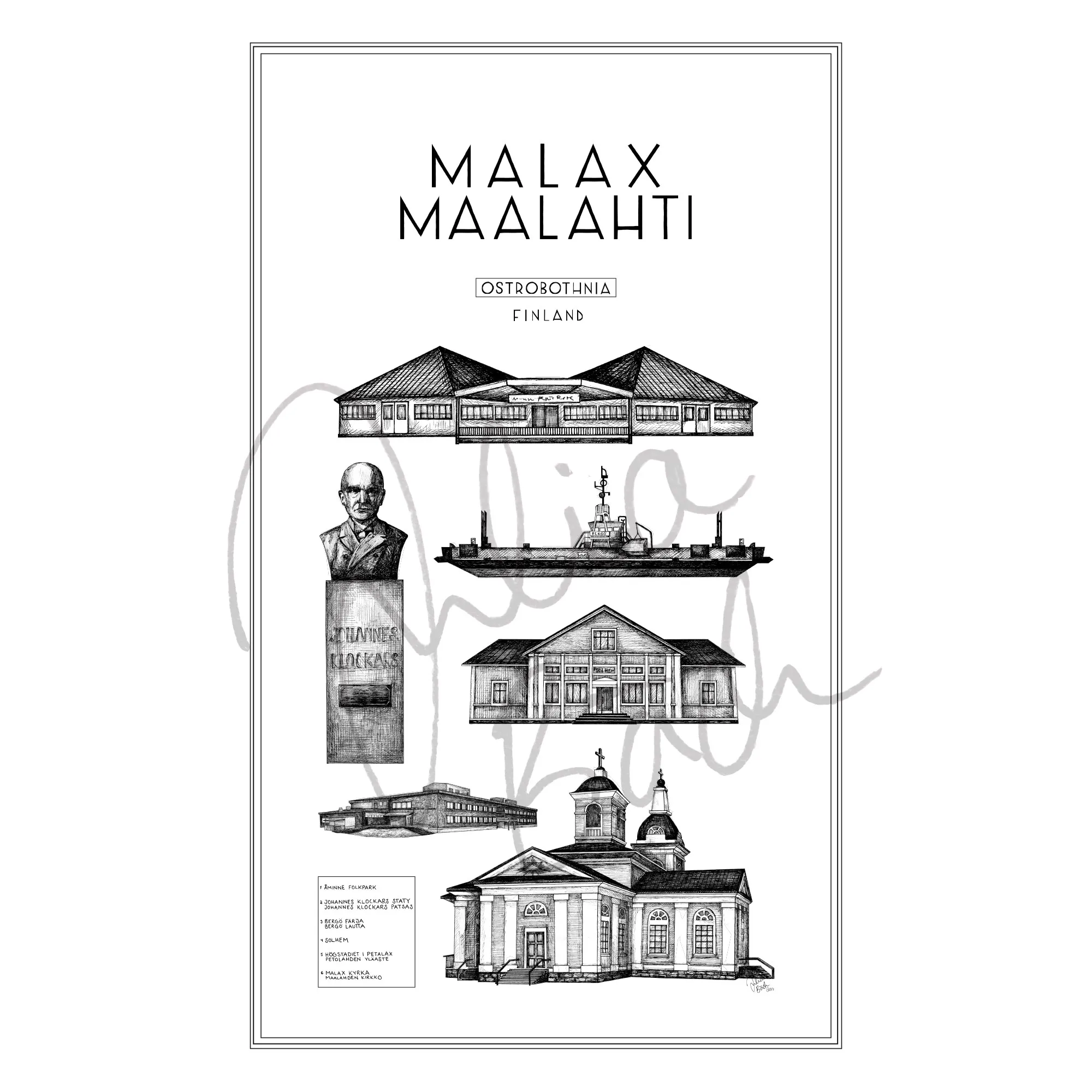 Unik tryckt poster av hög kvalitet baserad på den talangfulla konstnären Julias Bäcks handritade skisser av Malax vackra byggnader och monument.