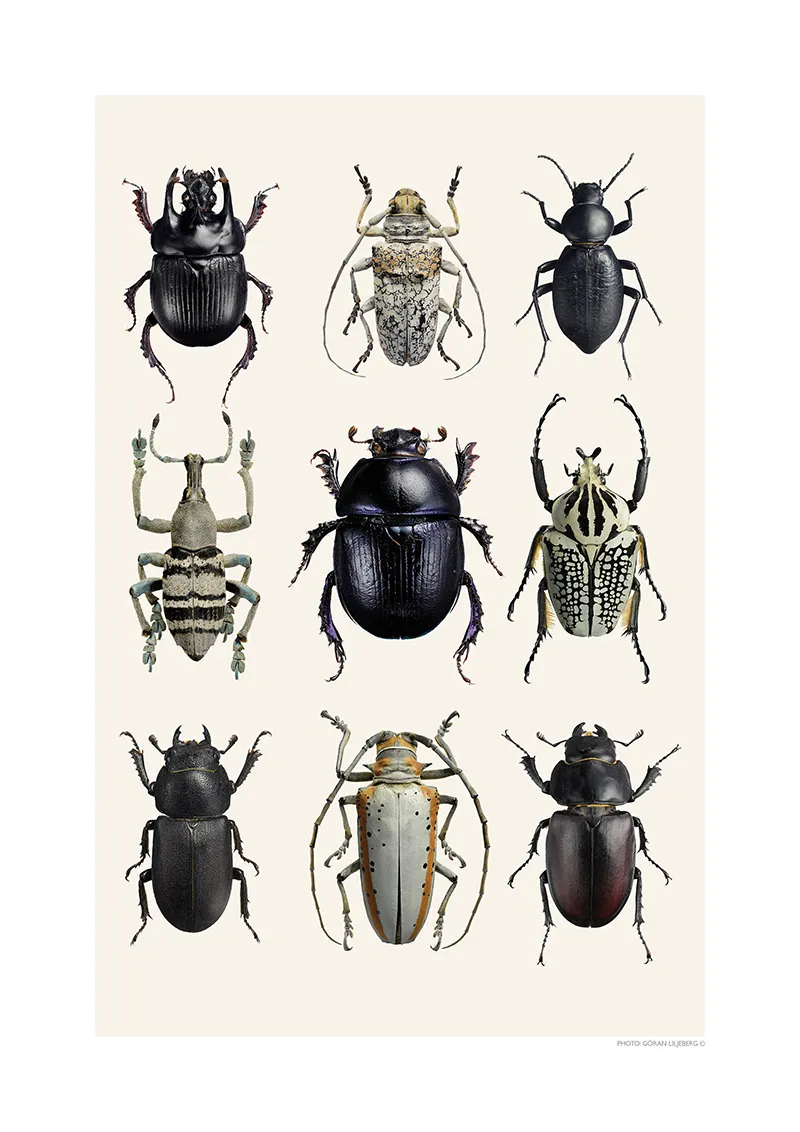Svarta och vita skalbaggar Beetles Black & White på detaljrik, uppförstorad poster. Makrofotografi av svenska fotografen Göran Liljeberg. En vacker affisch av hög kvalitet till både moderna och klassiska hem.