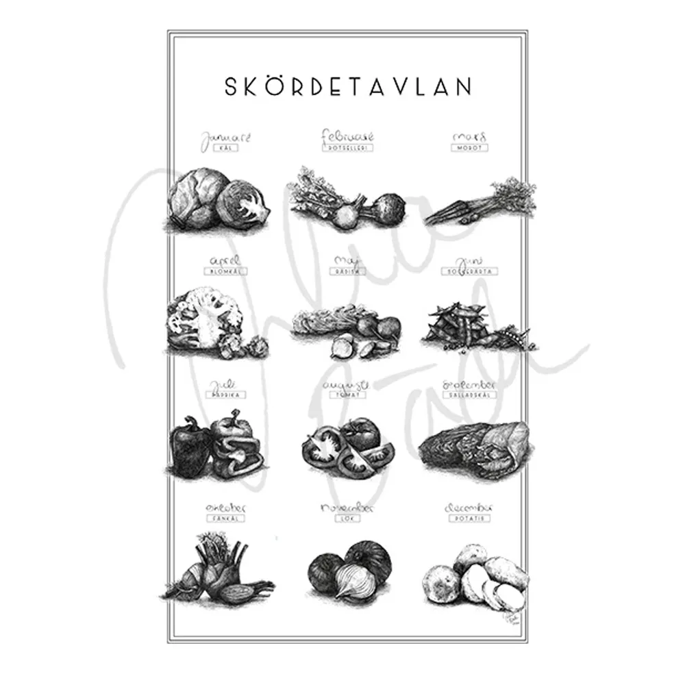 Skördetavlan By Julia Bäck är en snygg poster i svartvitt. Årskalendern visar när olika grönsaker och rotsaker är i säsong. Rotselleri, morot, sockerärter och lök finns med, liksom fänkål, rädisa och blomkål.